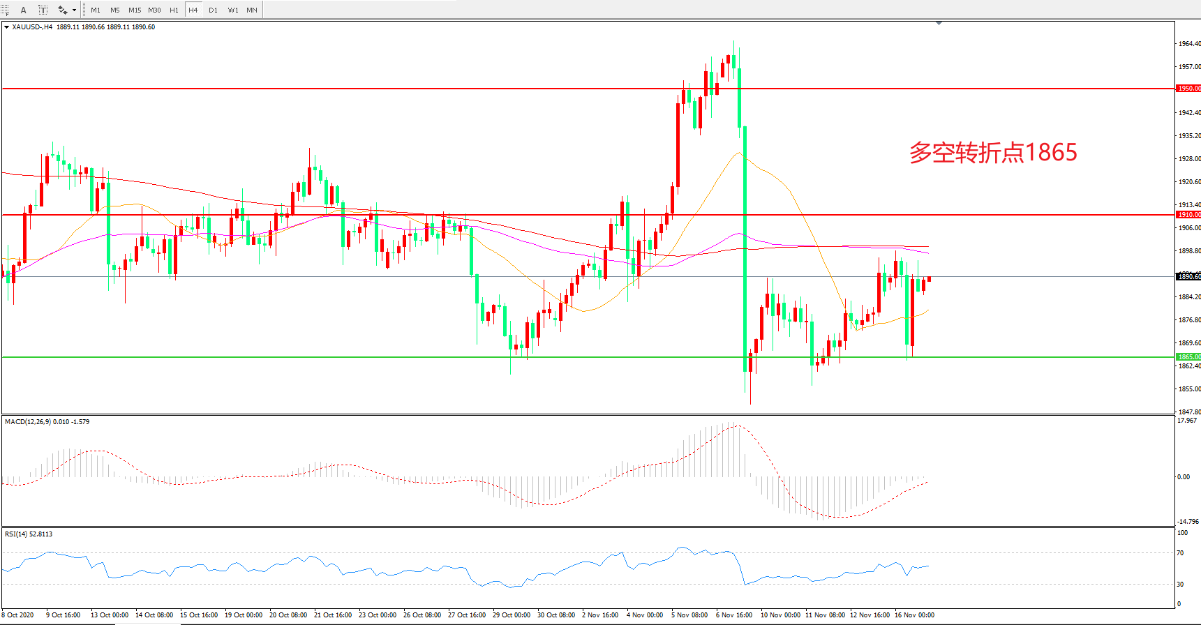 周一(11月16日),继辉瑞和俄罗斯疫苗之后,此前一度较为高调的莫德纳也宣布了好消息,其疫苗在预防方面的有效性超过94%,避险情绪回落导致金价一度重挫近30美元,但美元指数的回落为金价提供了上行动力,现货黄金自低位大幅反弹,收报1890.10美元/盎司。