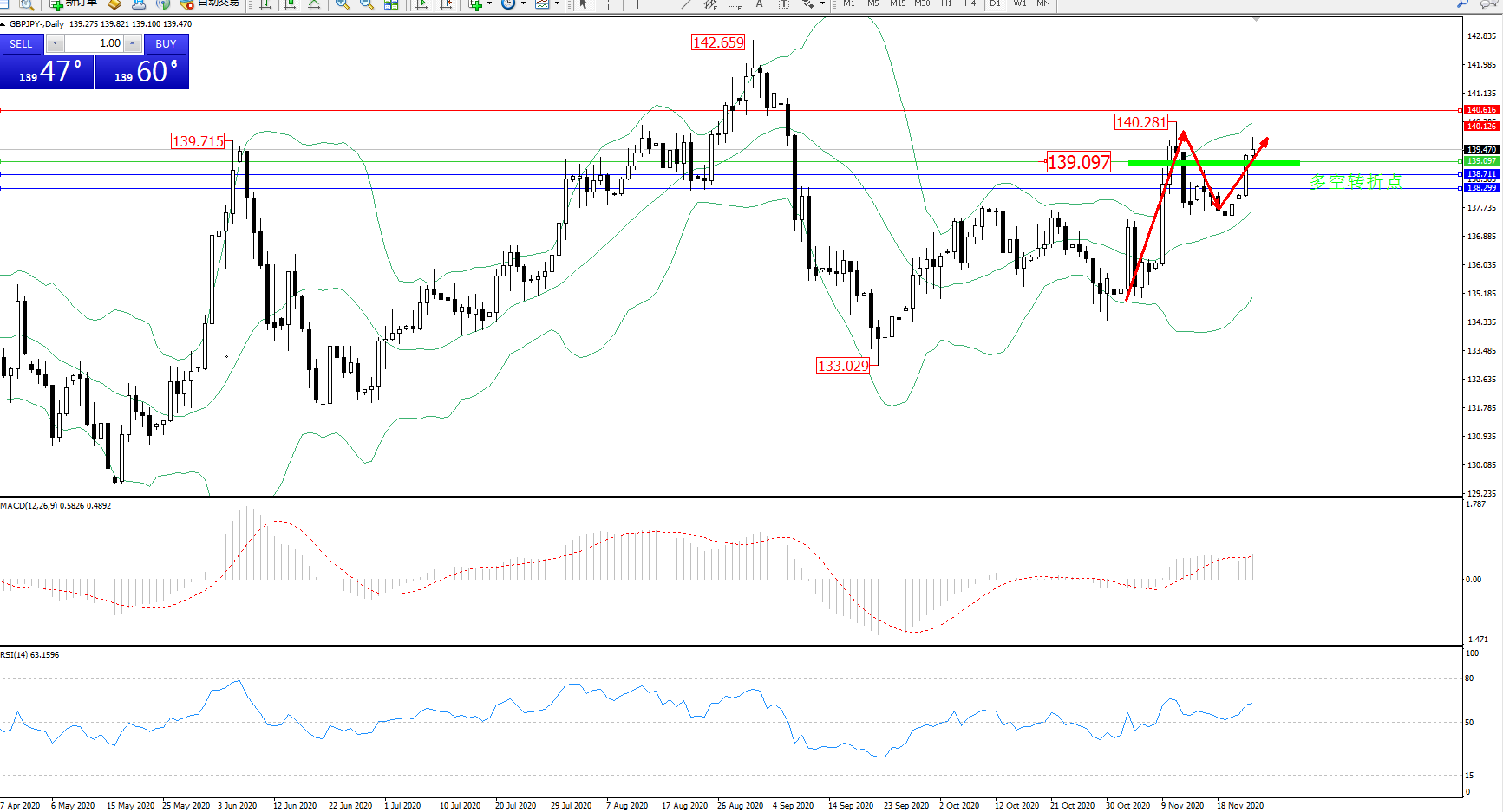 技术点评:多头动力延续布林带指标通道内中上轨区间持续震荡上扬走势拉升中,短期回撤至中轨附近节点后多头动力再度上扬,且有进一步上行态势,前期高位140.281位置近在咫尺,破位在即,布林带指标通道呈收口走势向上移动走势良好,MACD指标处于0轴线上方多头区域维持整理平移中,RSI指标处于50均衡线上方维持窄幅整理平缓上移中;
