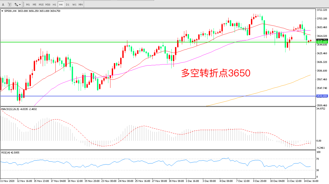 4小时图看,标普500高位震荡后连续下行短期涨势遭到破坏55周期均线均线拐头向下3650成为短期支撑 MACD红柱减少绿柱增加RSI指标走平,日内延续震荡概率较大