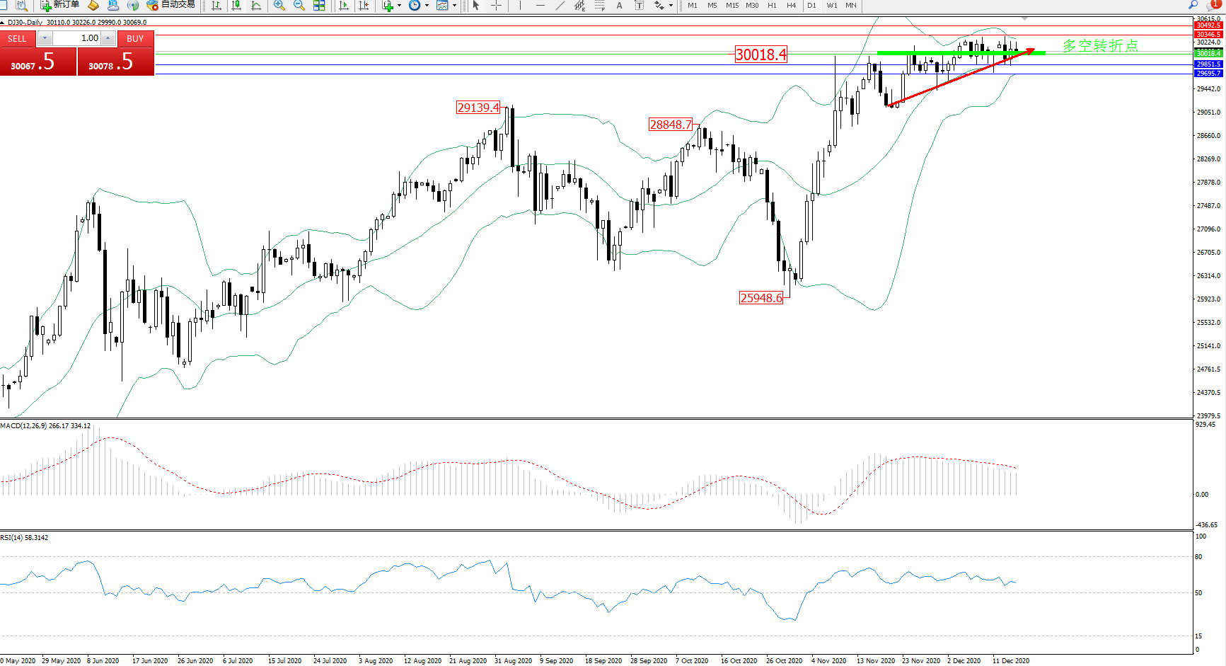 道琼斯指数12月16日(周三)收盘下跌44.80点,跌幅0.15%,报30154.54点。美股三大指数涨跌互现,抗疫概念股下挫,美联储将超额准备金利率(IOER)维持在0.1%不变,将贴现利率维持在0.25%不变。美联储将致力于使用所有工具支撑美国经济。上调经济增长预期和来年通胀预期,当前美国的疫情和财政刺激的形势仍然不确定,美联储在制定政策的时候也保持了谨慎的观点。美联储预计将维持当前的利率水平,直至劳动力市场符合充分就业评估,通胀升至2%并有望在一段时间内适度超过该水平。另外,美联储点阵图显示,美联储预计将维持利率在当前水平直至2023年,与9月一致。
