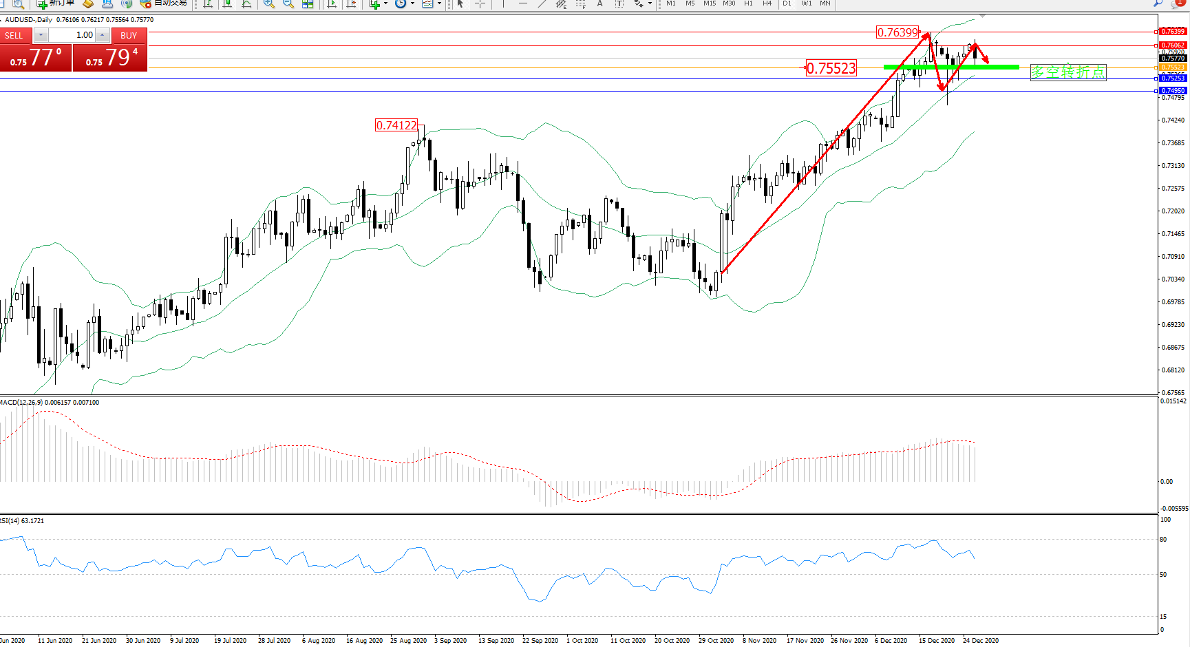 交易策略:0.75523上方看涨,目标0.76062、0.76399