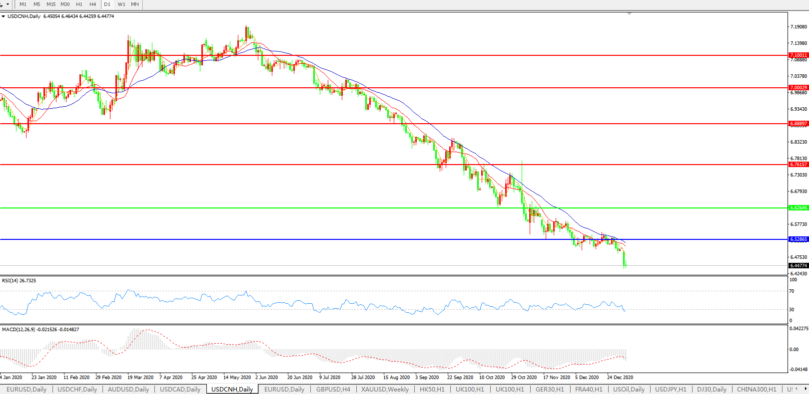 美元兑人民币USDCNH 日线图: