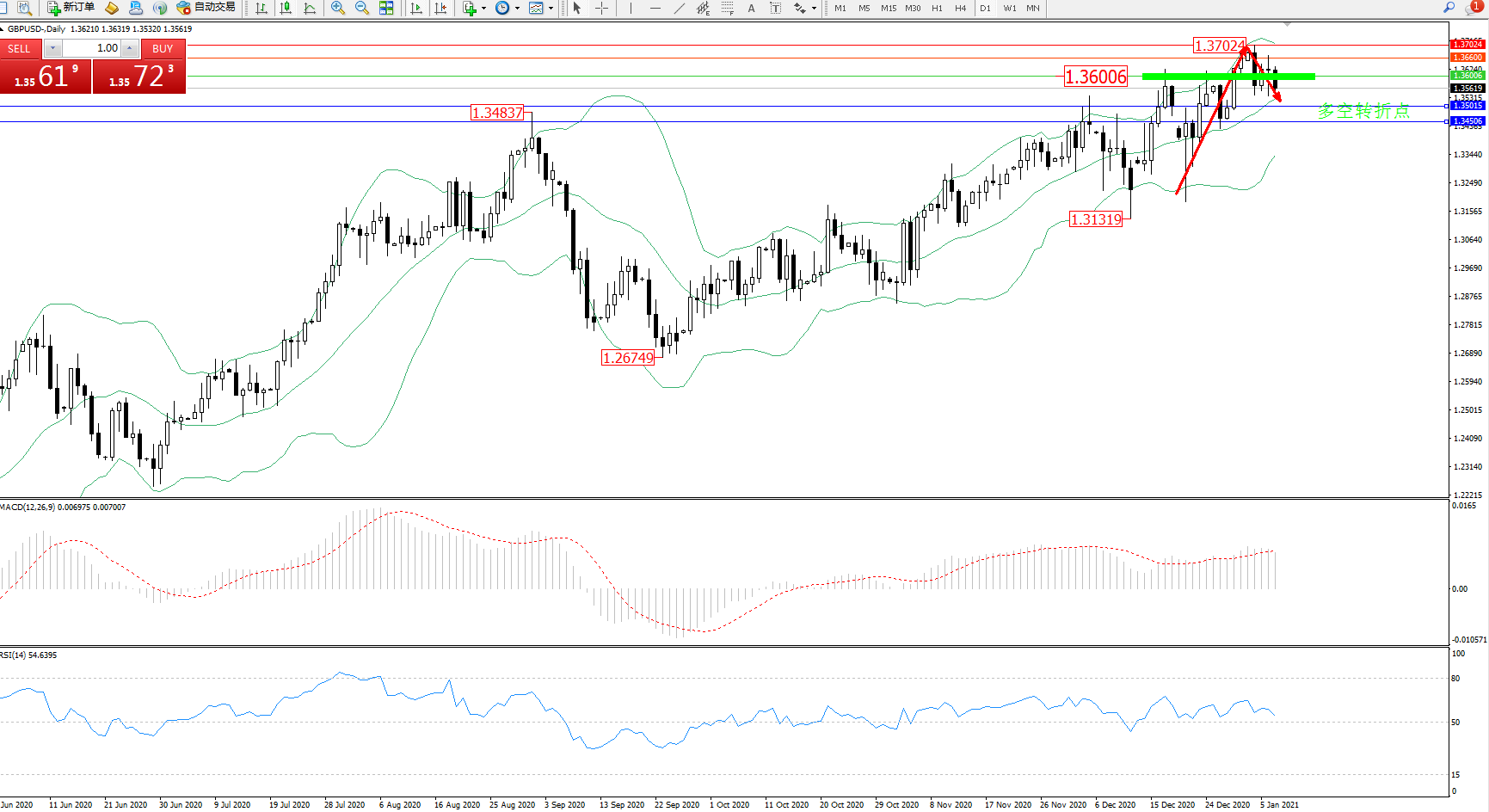 交易策略:1.36006下方看跌,目标1.35015、1.34506