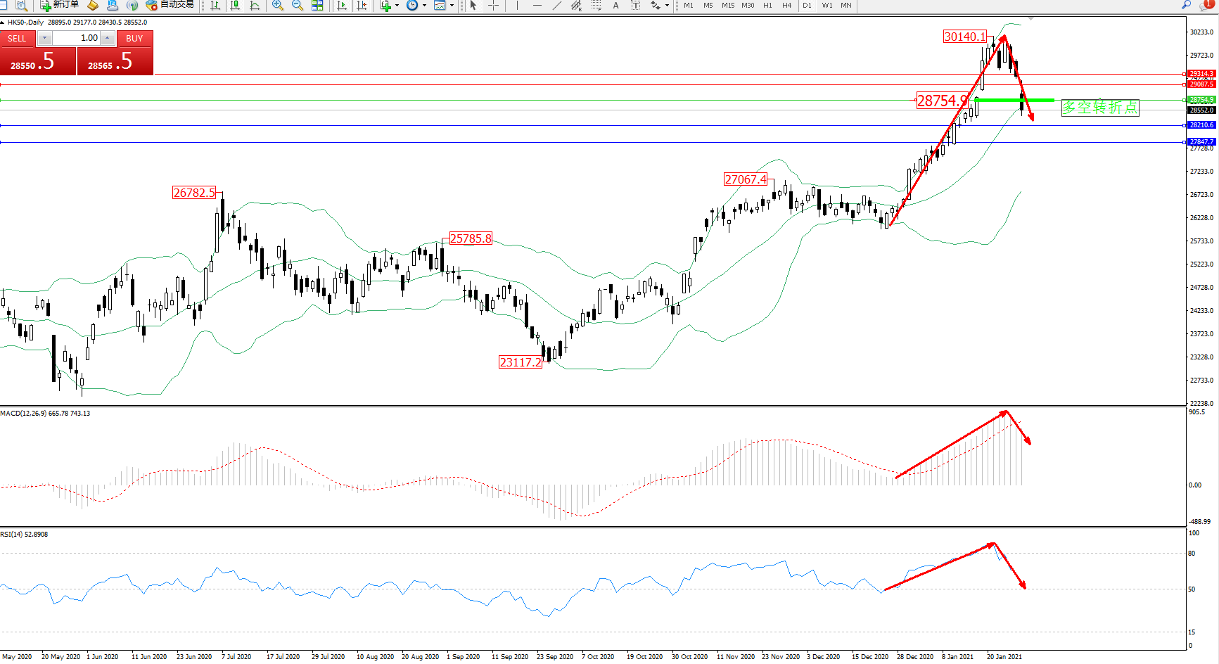 技术点评:多头动力延续布林带指标上轨附近持续震荡上扬至30140附近遇阻开始急速回撤,触及布林带指标中轨附近节点后有继续下行态势,布林带指标呈上行趋势通道走势持续上扬后开始有收口下移迹象,关注中轨附近关键转折点,MACD指标处于多头区域高位弱势整理缓慢回撤下移,RSI指标高位空头动力持续震荡回撤即将触及50均衡线附近节点;