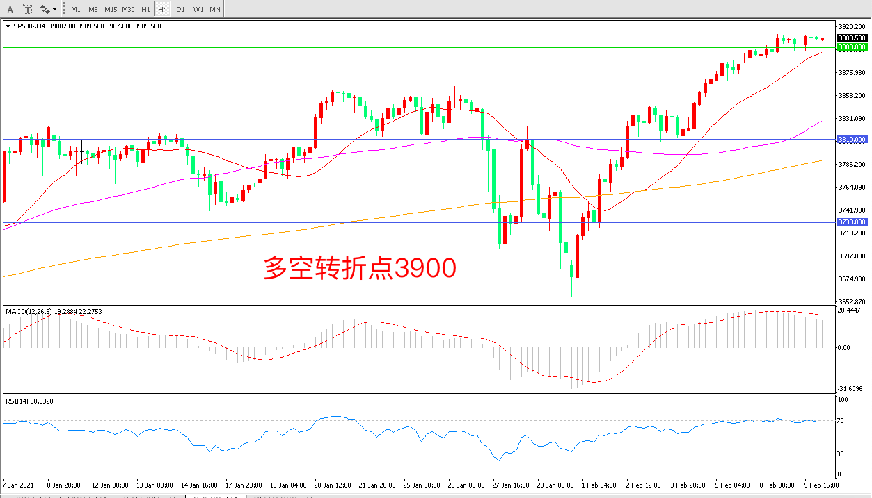 4小时图看,标普500长阳拉升后高位窄幅震荡,短期表现异常强势,均线系统拐头向上,MACD红柱增加,RSI指标走平,日内延续上行概率较大。