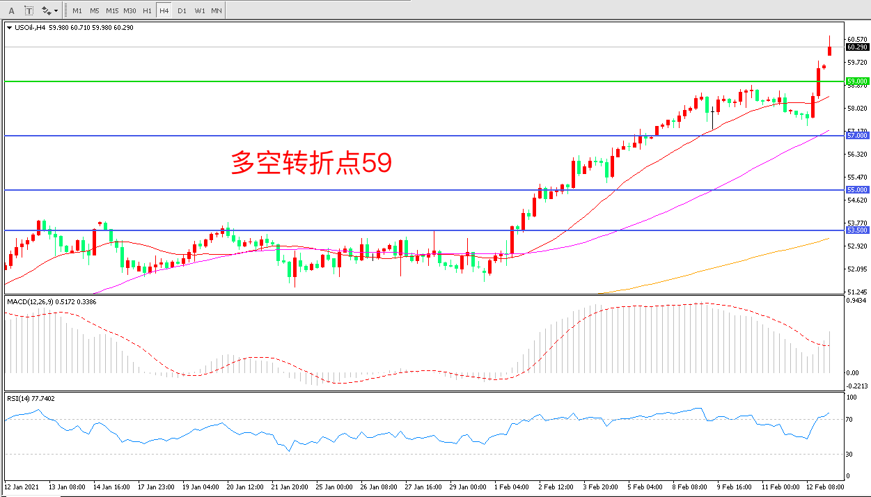 4小时图看,油价连续上涨后再度突破,上行趋势十分明显59美元被顺势突破行情进入加速阶段MACD红柱增加RSI指标向上,日内延续上行概率较大。