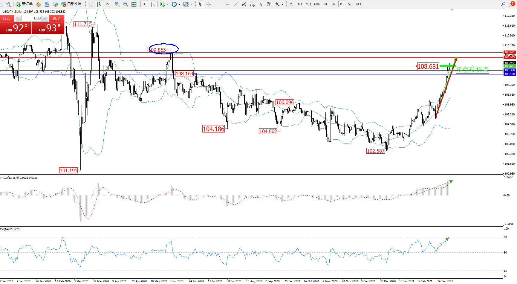 技术点评:多头动力延续布林带指标上轨附近节点持续震荡上扬态势良好,且多头动力未见止步迹象,前期高位109.865附近节点近在咫尺破位在即,布林带指标呈张口走势持续中,MACD指标处于多头区域维持整理平缓向上移动态势良好,RSI指标处于多头区域持续震荡上移触及超买区80均衡线附近节点徘徊;