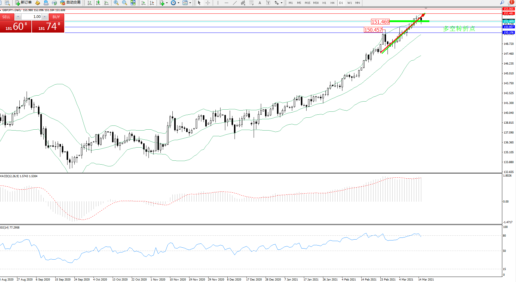 英镑兑日圆处于高位151.608附近整理,今年英国经济将会复苏,在年底左右回到2019年底的水准。英国央行周四结束3月会议时,预计将维持利率于纪录低点0.1%及8950亿英镑(1.25万亿美元)的购债规模不变。近金融市场利率的上升与经济前景的改善相符。当前风险更为均衡,预计未来几个月通胀率将加速升向2%,问题在于通胀能否持续上升,预计通胀率不会升向4-5%,策工具尚未用尽,要求银行业者为负利率做好准备但对是否使用负利率不持观点,不会用量化宽松为政府需求融资。贝利告诉媒体,我们非常密切地关注利率和金融市场。在过去的一个月左右,看到利率有所升高,其他国家也是如此。到目前为止我的看法是,这与经济前景的改变是一致的。
