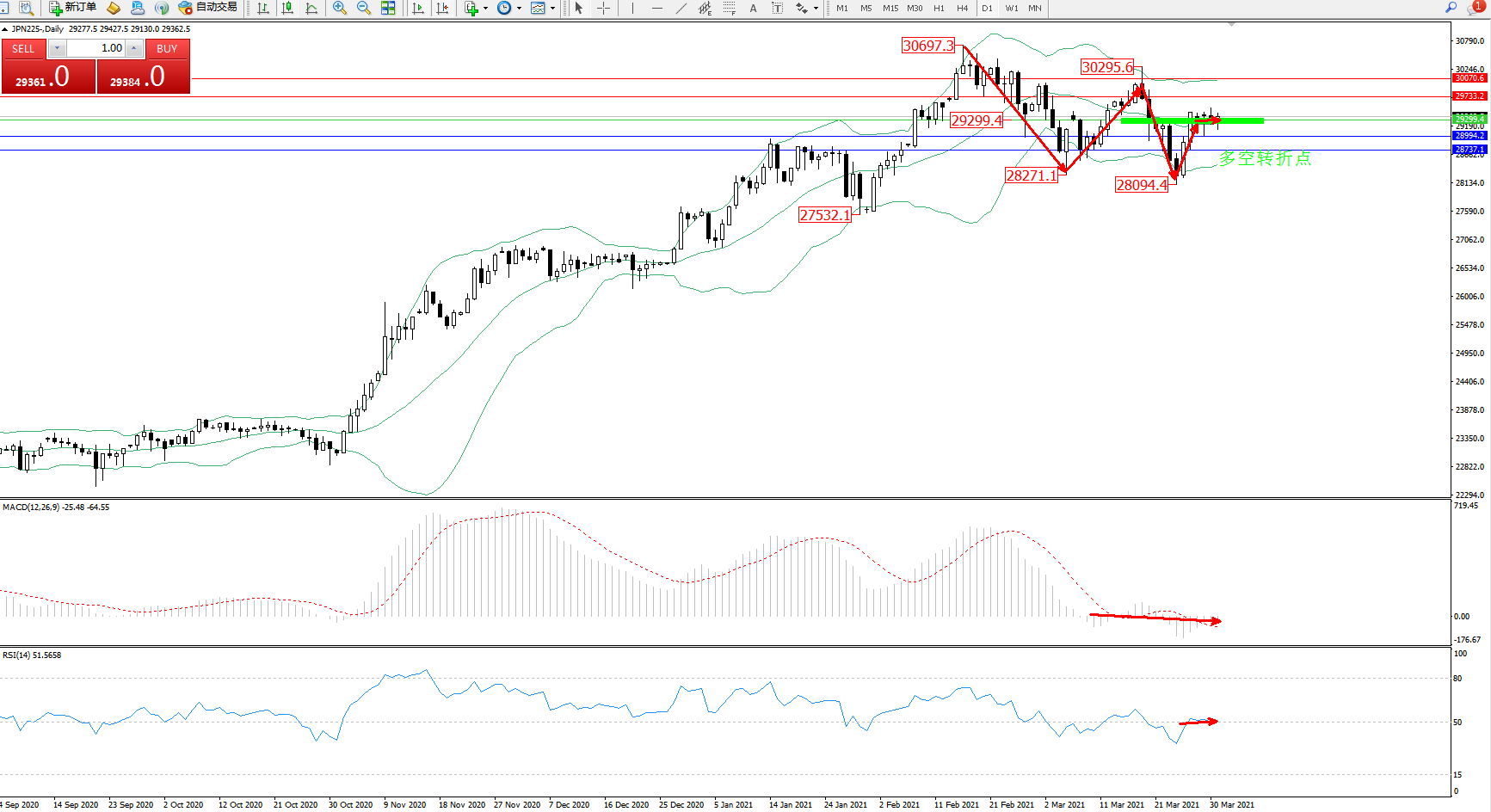 日经225指数3月31日(周三)收盘下跌225.70点,跌幅0.77%,报29207.00点。日本2月工业产出下降,因汽车和电机产量下降,对于勉力从疫情冲击中复苏的日本经济而言,这是个令人担忧的迹象。由于从1月初开始对东京及周围地区第二次实施抗疫紧急状态,日本第一季经济预计萎缩。在1月表现强劲的基础上,2月工业生产较前月下降2.1%,这应不会阻止第一季工业生产上升,数据表明,东北部部分地区2月13日地震可能有点影响产出。1月工业生产反弹基本归功于电子零部件和一般用途的机械产品生产大幅增长。但是在2月,汽车、电机产品、化学品、讯息及通讯电子设备的生产都呈现下滑,即便主要的产出驱动力--技术制造设备需求日增,也无济于事。尽管许多国家已在进行疫苗接种,但经济重启速度缓慢,海外需求复苏慢于预期叠加国内疲弱支出恐将拖累日本经济复苏。