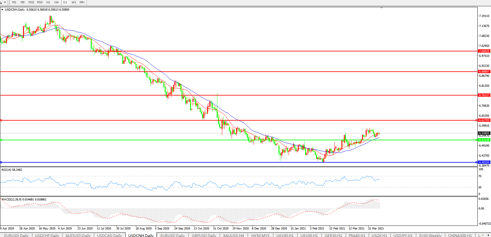 美元兑人民币USDCNH 日线图: