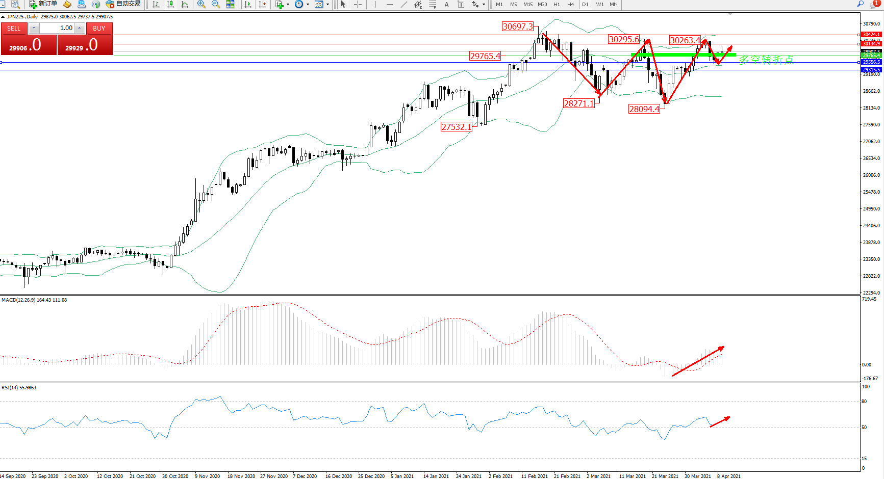 技术点评:长时间维持在布林带指标通道内宽幅震荡持续中,期间多次来回试探上下轨区间节点,多头动力上行至30263位置后遇阻回撤,触及布林带指标中轨附近节点后反转上移,MACD指标处于0轴线上方多头区域维持震荡后有回撤迹象,RSI指标处于50均衡线上方多头区域维持震荡后反转急速下行中;