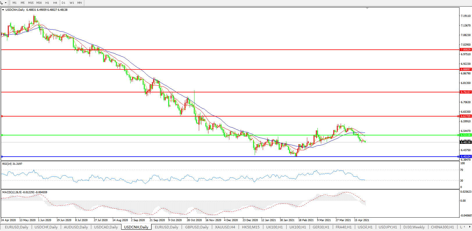 美元兑人民币USDCNH 日线图: