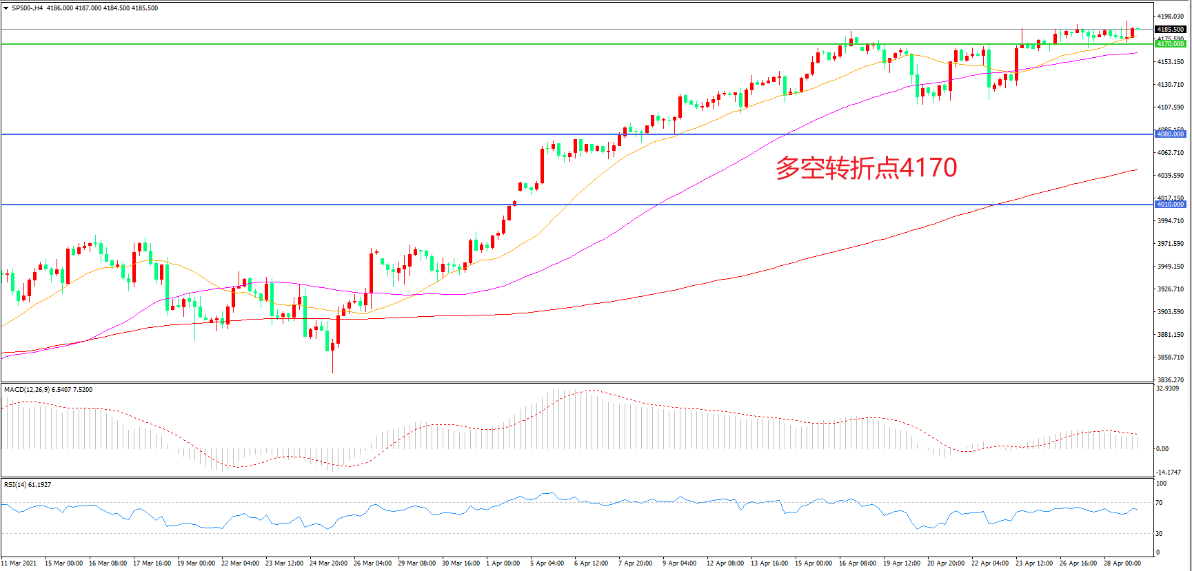 4小时图看,标普500跌突破4170后延续高位震荡,价格整体波幅不大,均线系统逐渐走高,MACD红柱增加,RSI指标走平,日内延续震荡概率较大。
