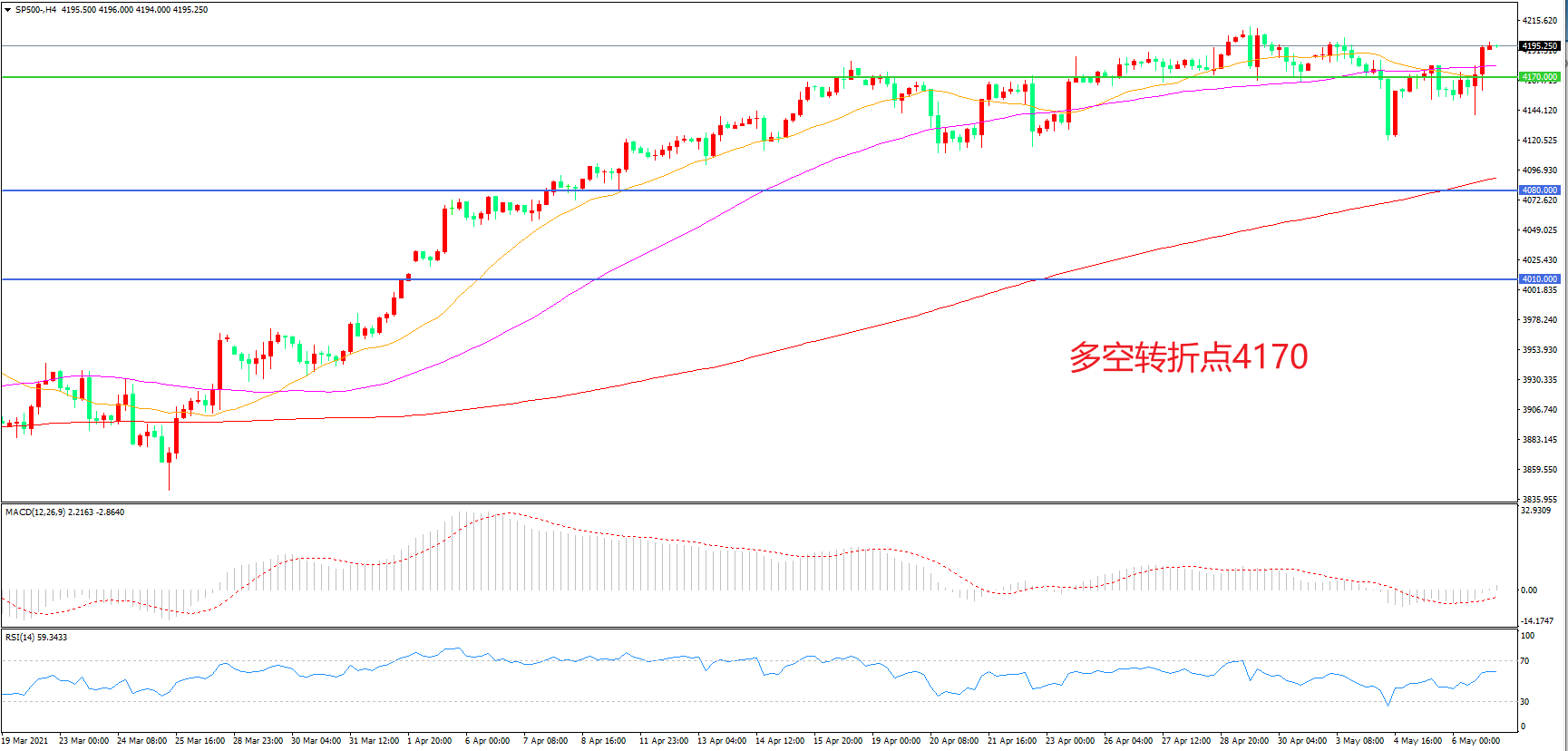 4小时图看,标普500长针探底后再度拉升,显示下方支撑较强,均线系统逐渐粘合,4170成为多空分水岭,MACD红柱增加,RSI指标走平,日内震荡上行概率较大。