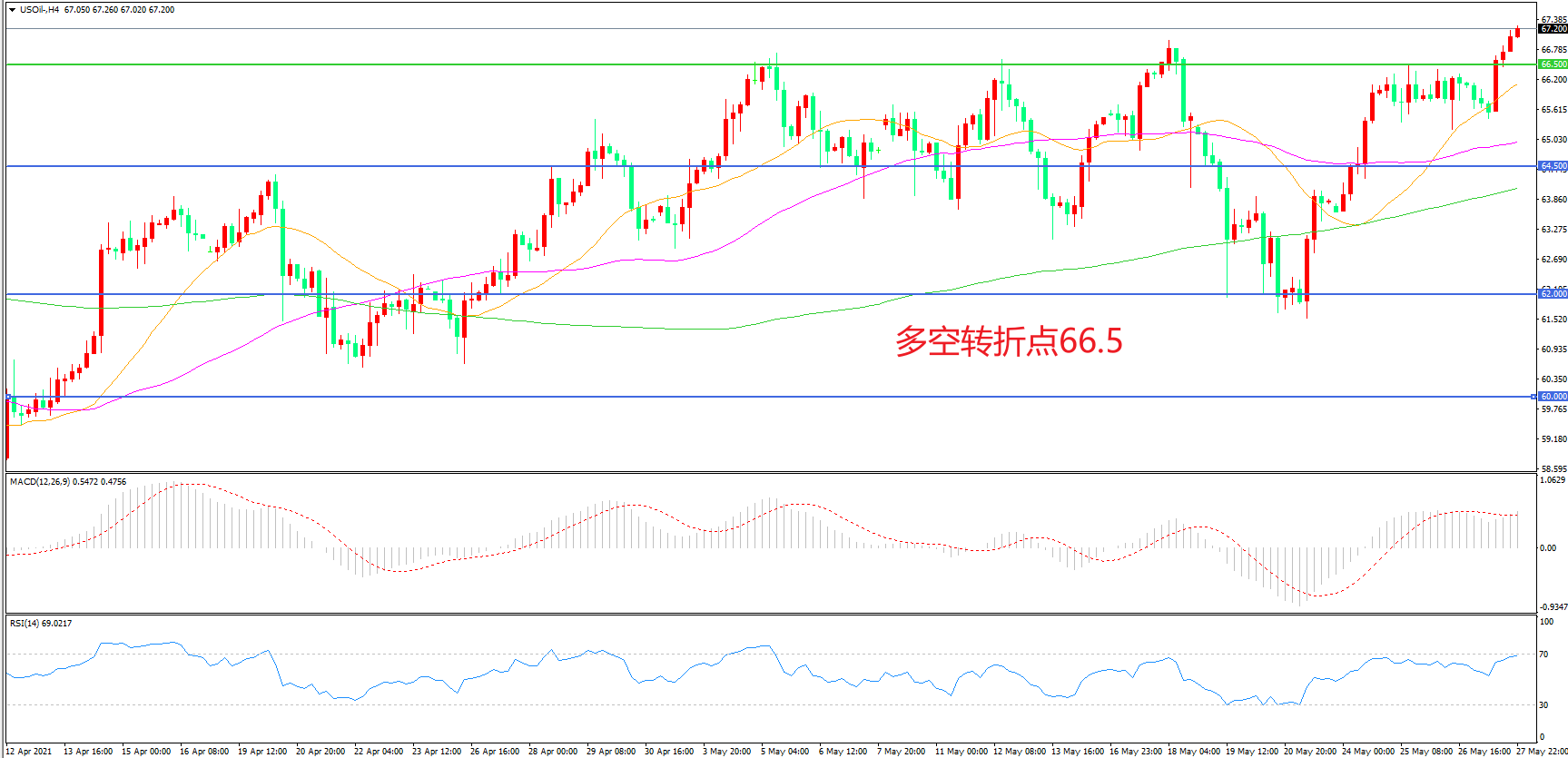 4小时图看,油价强势突破前期整理区间,整体表现十分强势,69美元成为中期阻力,66.5成为下方支撑,MACD红柱增加,RSI指标向上,日内震荡上行概率较大。