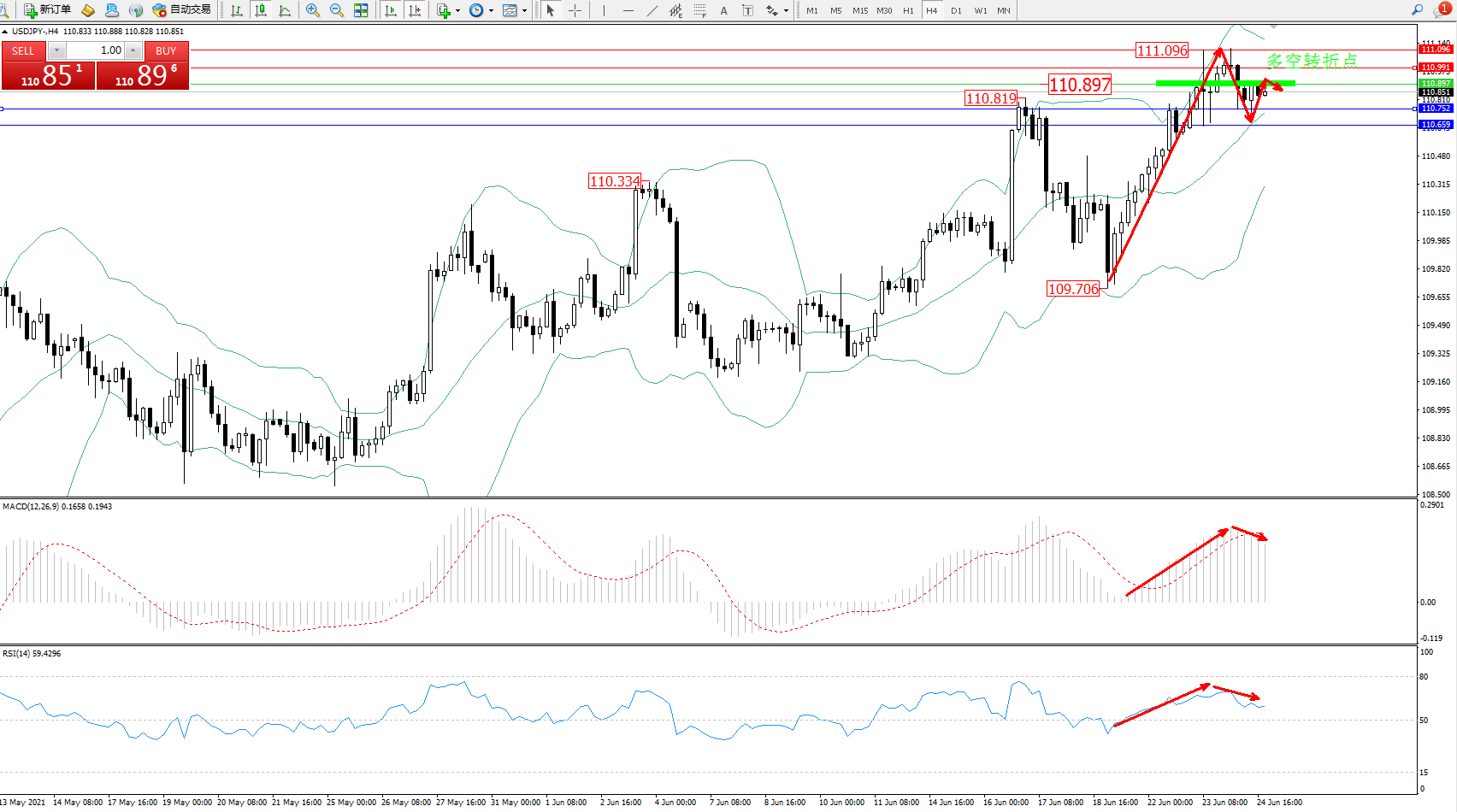 技术点评:多头动力延续布林带指标通道中上轨区间持续震荡上扬,高位抵达111.096位置后遇阻,开始整理回撤,触及中轨附近节点开始巨震,短期或将继续维持高位震荡走势,布林带指标呈收口走势持续中,MACD指标处于多头区域高位震荡后开始缓慢回撤中,RSI指标处于多头区域高位整理缓慢回撤后开始平移;