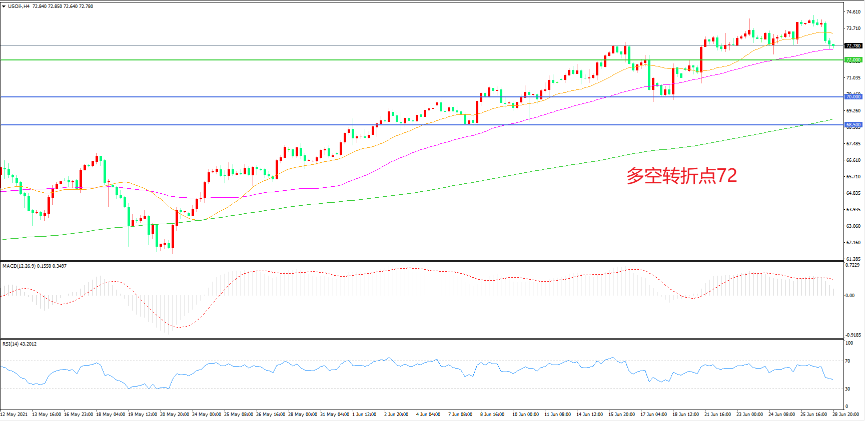 周一(6月28日),更具传染性的Delta变异毒株导致亚洲和澳大利亚部分地区重新实施封锁,对原油需求反弹构成威胁,美国WTI原油小幅回落,收报72.73美元/桶。OPEC会议将于本周四举行,现在可以肯定的是在会议上将会提高原油增产的额度,市场越来越多资金开始持观望态势。如果OPEC仅仅是增加25-50万桶,那么对于市场来说增产的幅度可以接受,油价在调整之后或许会重新回到上行的趋势之中。