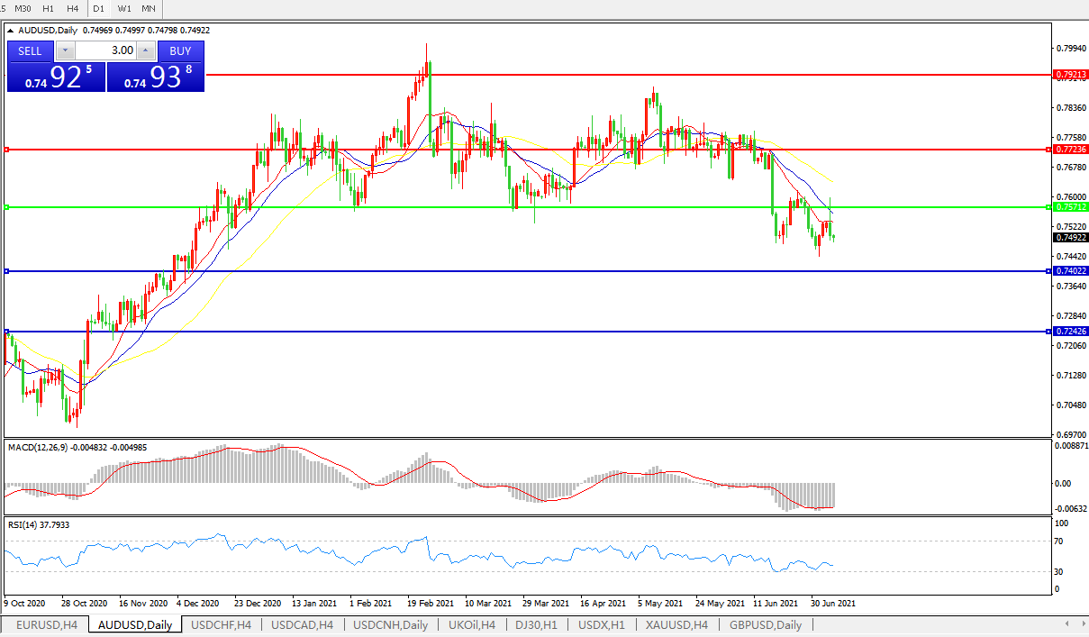 交易策略:0.7570下方看跌,目标0.7400、0.7240