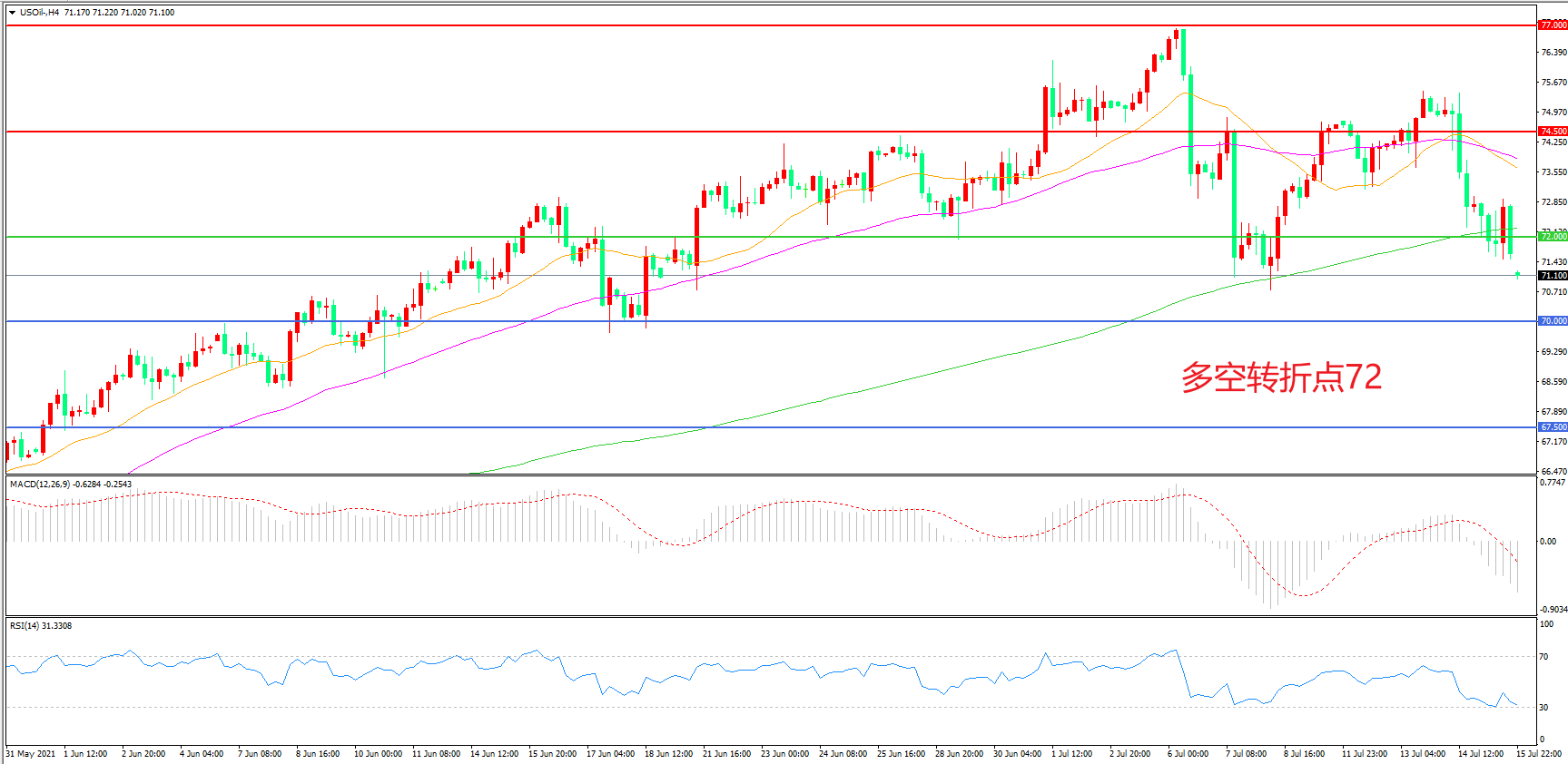 周四(7月15日),OPEC坚持其对2021年剩余时间世界石油需求强劲复苏的预测,但OPEC内部阿联酋与沙特阿拉伯的分歧让市场陷入恐慌,在众多的利空因素打压之下,美国WTI原油再度下行,收报71.61美元/桶,周四(7月15日凌晨),油价跳空低开,报71.12美元/桶。 此前市场有报道称,美国在不断的暗示可能会放出委内瑞拉原油产量,最近美国又暗示可能会放出伊朗的原油产量,供给端的这些变量也让悲观的情绪弥漫整个市场。