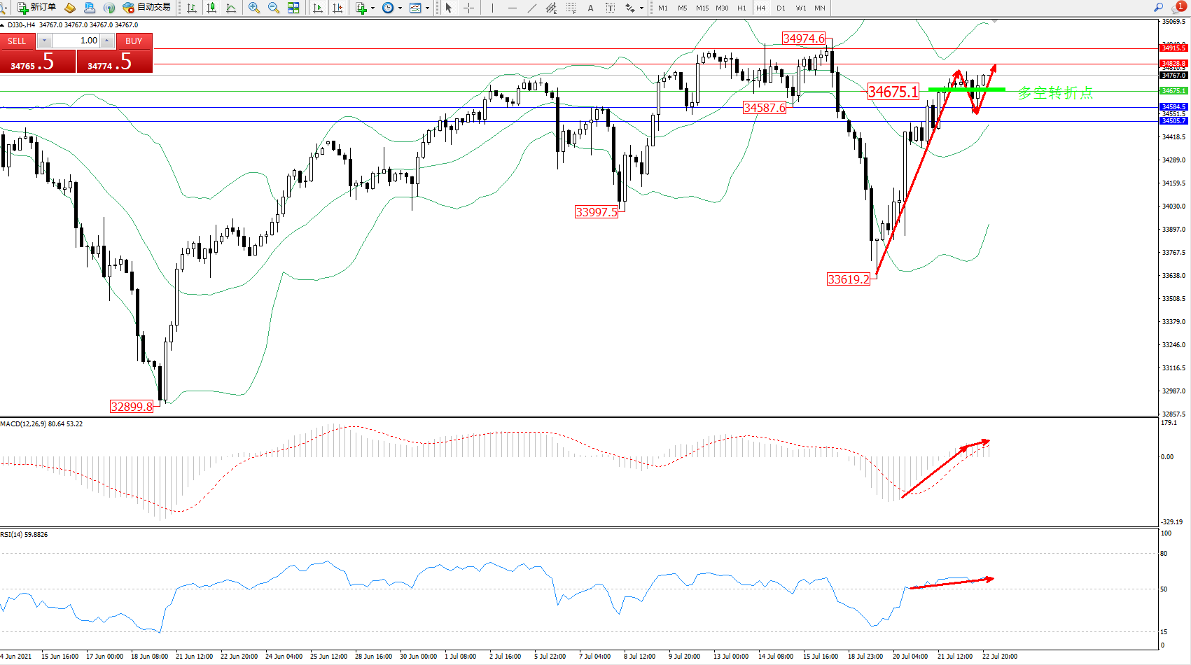 道琼斯指数7月22日(周四)收盘上涨25.15点,涨幅0.07%,报34823.15点;美股收盘,道指接近平收,大型科技股普涨。美债收益率在触及近一周高位后回落,股市亦缩减盘初的涨幅,数据显示美国初请失业金人数意外升至两个月高位,美联储下周将召开政策会议,此前美联储主席鲍威尔表示,尽管近期通胀数据大涨,但美联储将保持宽松政策。