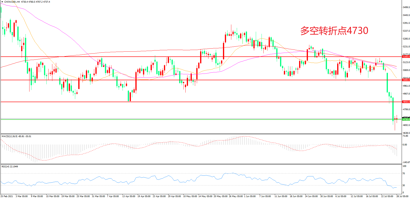 4小时图看,沪深300长阴下破后十字星收盘,短线行情有所企稳,4850成为上方阻力,4730成为多空分水岭,均线系统下压的情况下,中期走势依然偏空,但日内可能出现小幅反弹。