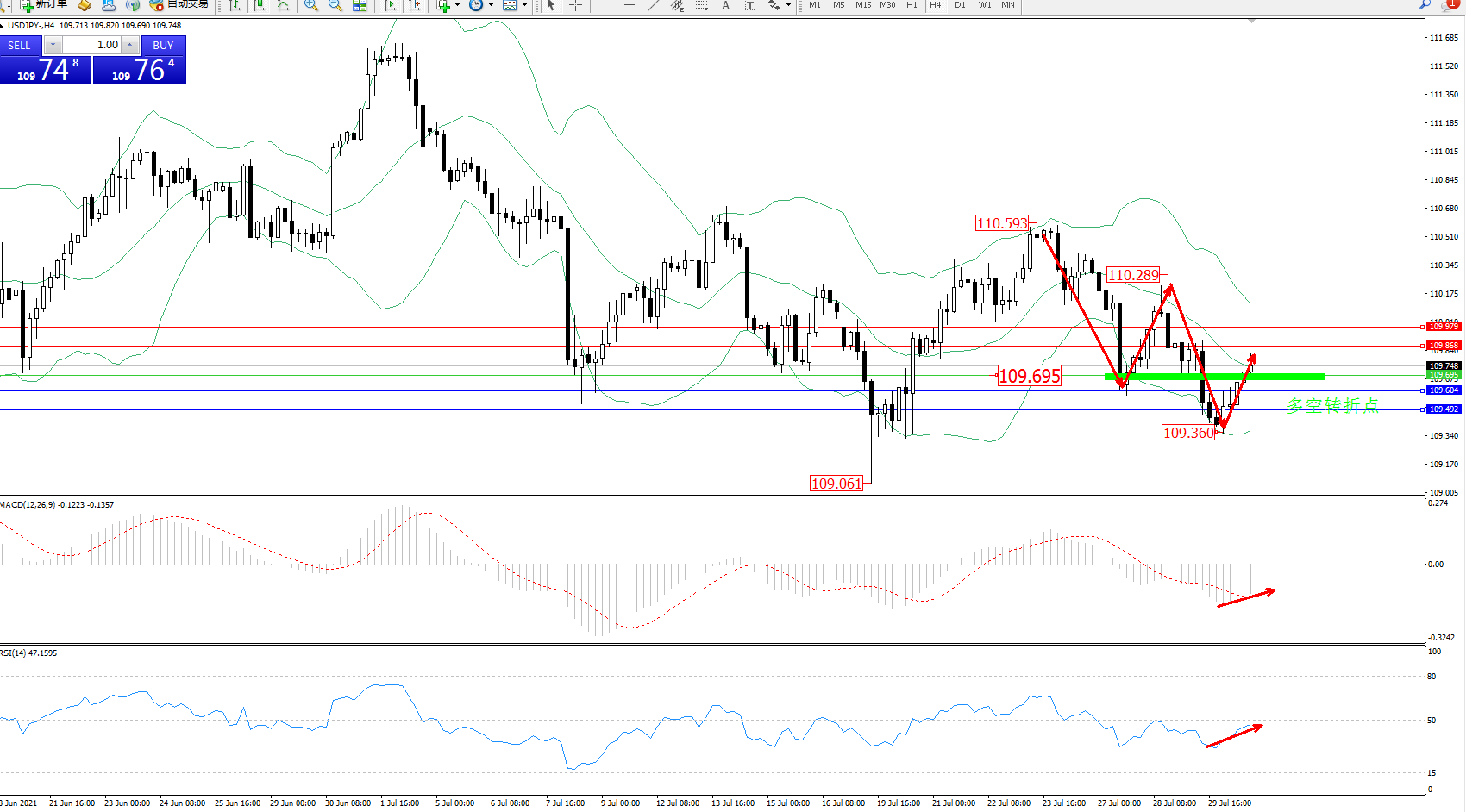 技术点评:空头动力延续布林带指标通道中下轨区间持续震荡下行,低位抵达109.360位置后开始短暂回升,触及中轨附近节点后开始整理,短期或有进一步回升迹象,布林带指标呈下行趋势后开始收口迹象,MACD指标处于空头区域低位震荡缓慢回升,RSI指标处于空头区域低位震荡缓慢上移后即将触及50均衡线附近节点;