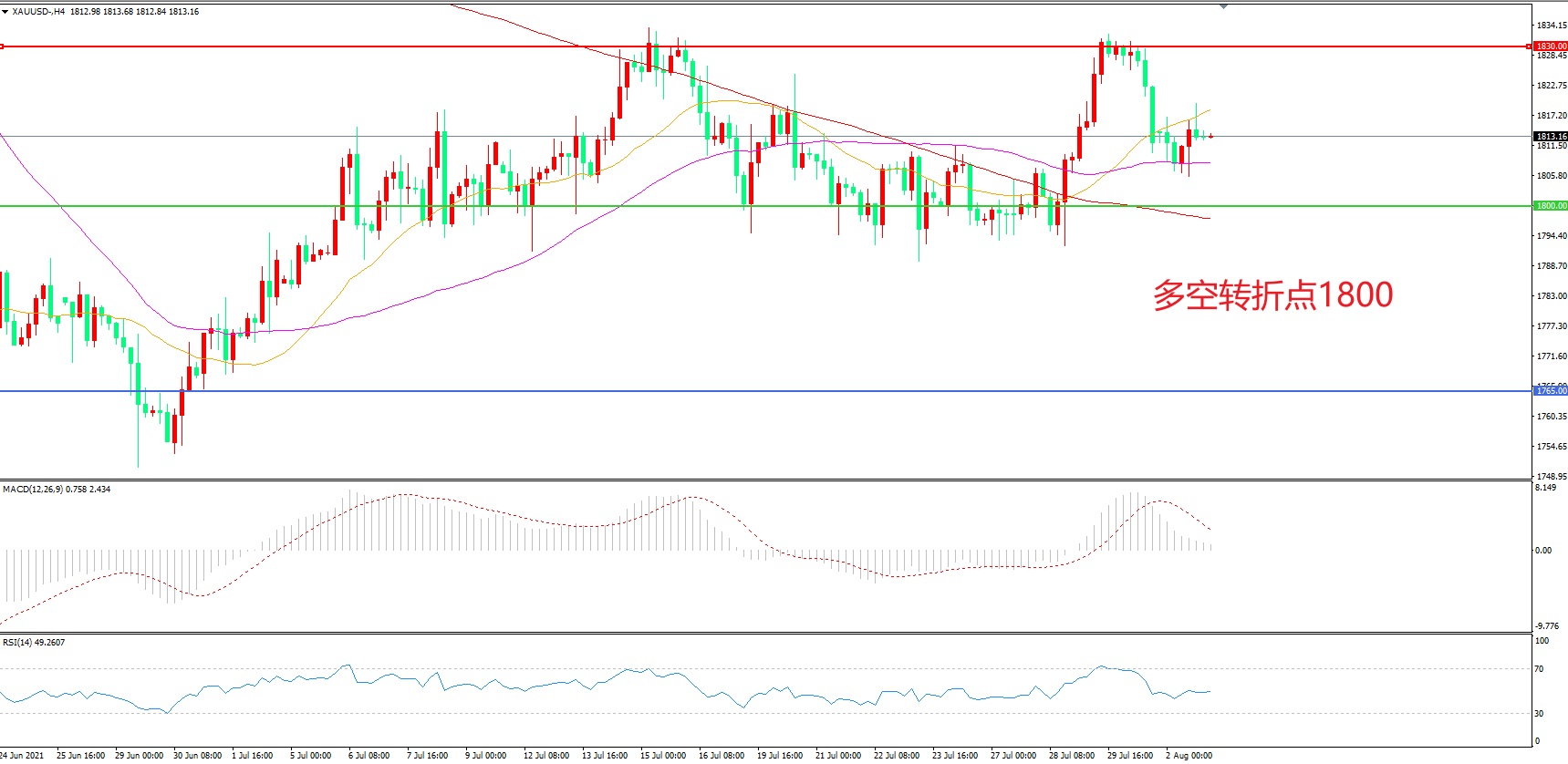 备选策略:在1800.00之下看跌,目标1765.00 1730.00