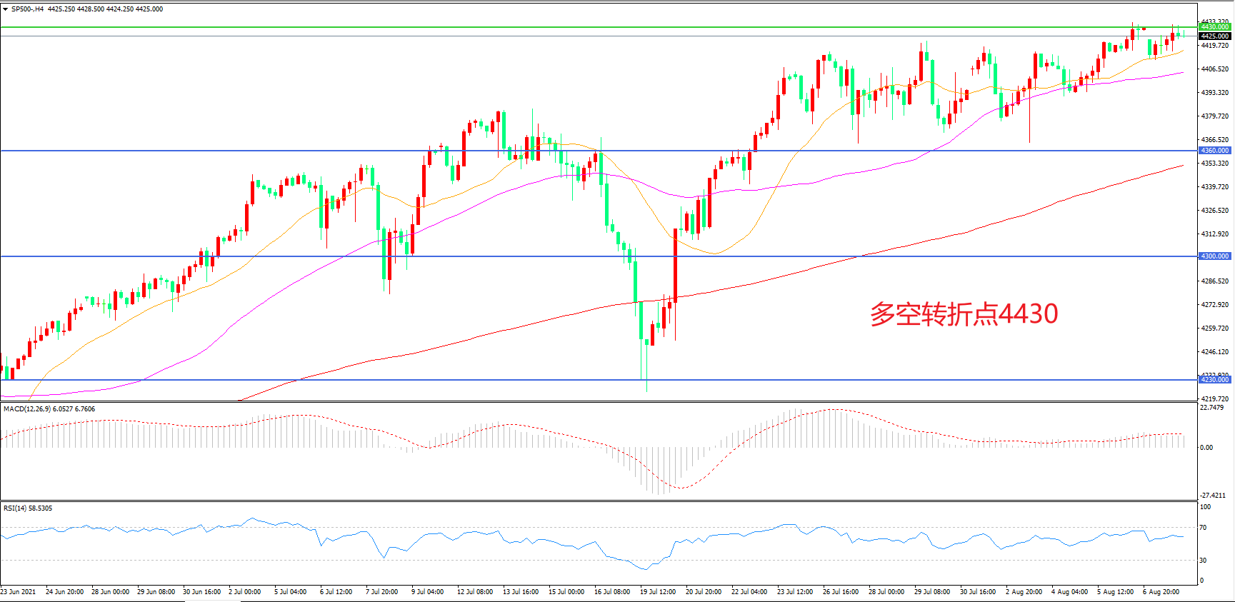 4小时图看,标普500以均线系统为支撑震荡上行,短期表现偏强,21周期均线成为下方支撑,4430成为多空分水岭,MACD红柱增加,RSI指标走平,日内震荡上行概率较大。