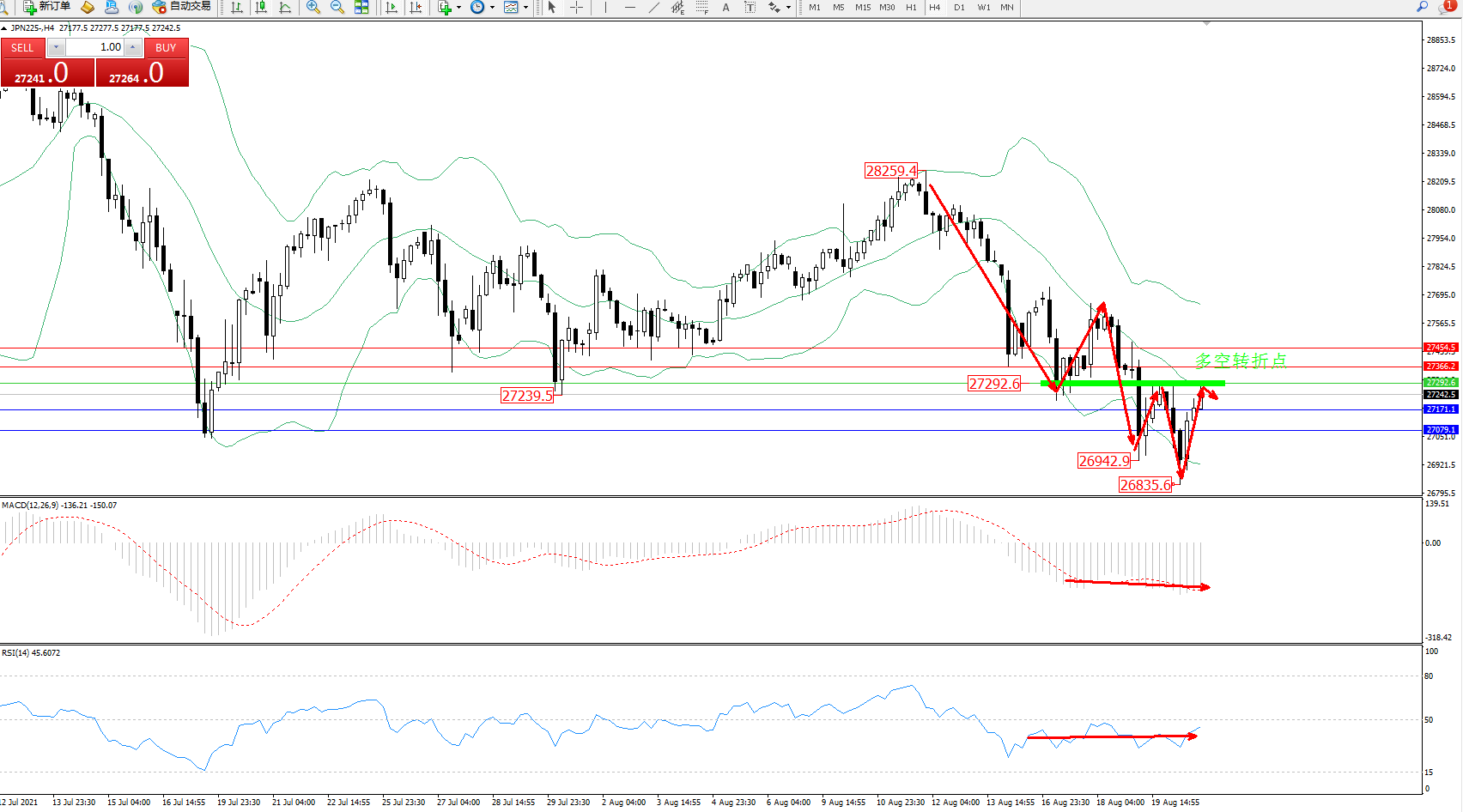 技术点评:空头动力延续布林带指标中下轨区间呈阶梯式震荡不断下行,低位抵达26835位置得到支撑回升,即将触及布林带指标中轨附近节点,布林带指标呈下行趋势走势持续中,MACD指标处于空头区域维持整理平移,RSI指标处于50均衡线下方维持窄幅整理后有短暂回升迹象;