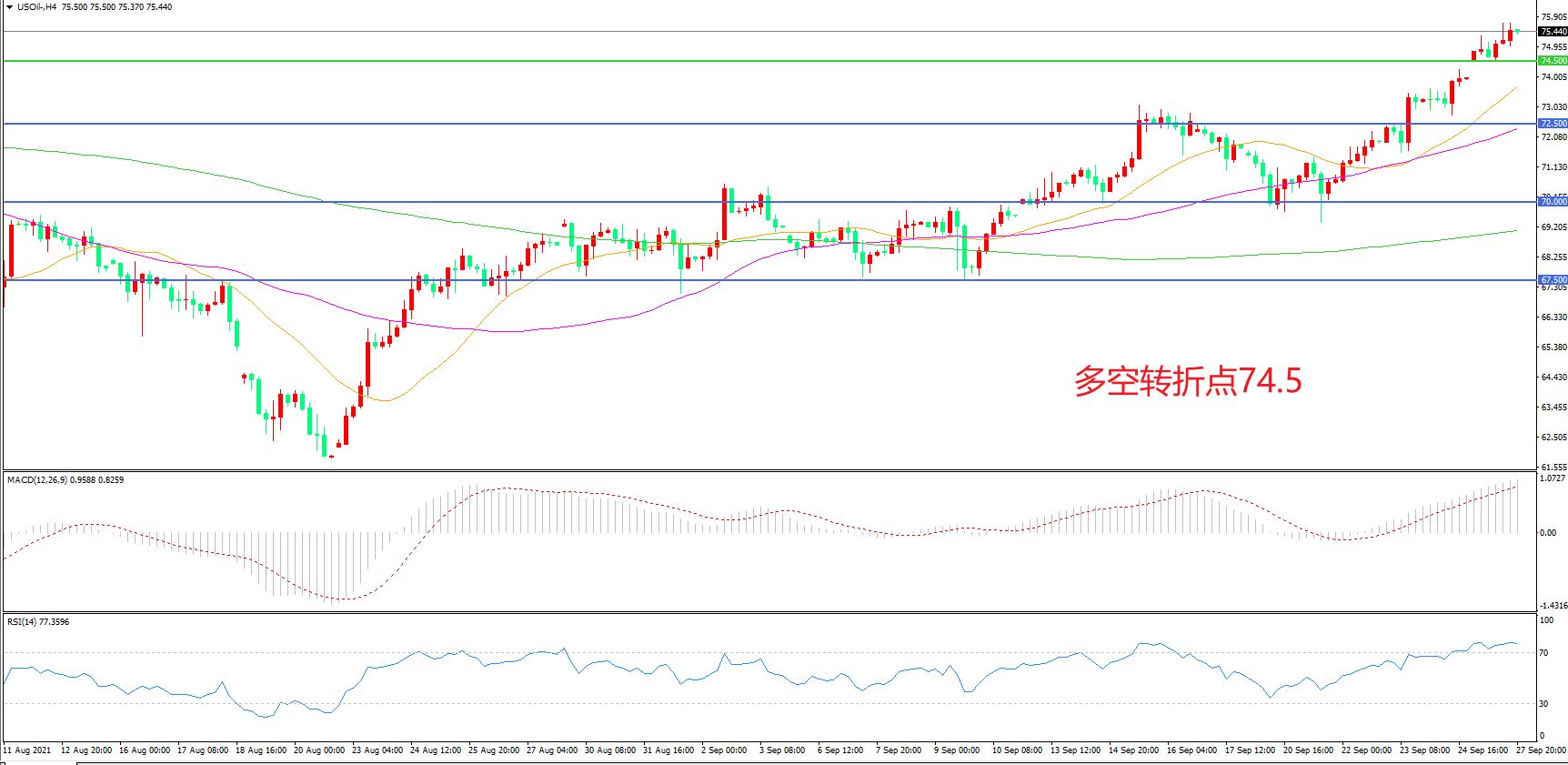 周一(9月27日),寒冬的预期以及大宗商品的大涨对多头信心形成了提振,最近投行和原油大贸易商对于未来价格预期的言论,更是强化了这种市场上行的格局,美国WTI原油大幅上行,收报75.43美元/桶。当前受飓风影响下,美国产量没有完全恢复,同时OPEC也在管控着产量的增长,这将会进一步加剧供给紧缺的程度,油价有望再度冲高。