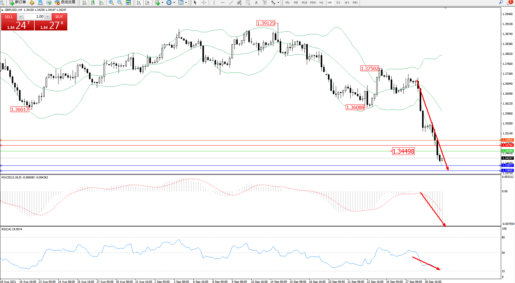 交易策略:1.34498下方看跌,目标1.33977、1.33800