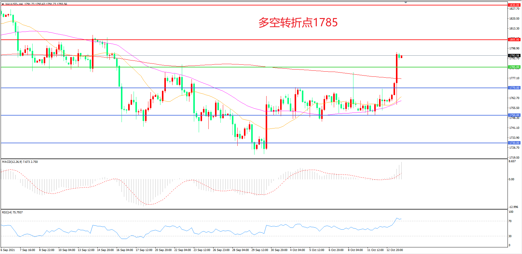 4小时图看,金价冲回踩均线支撑后强势拉升,整体表现偏强,1800关口成为短期阻力,1785成为多空分水岭,MACD红柱增加,RSI指标走平,日内震荡上行概率较大。