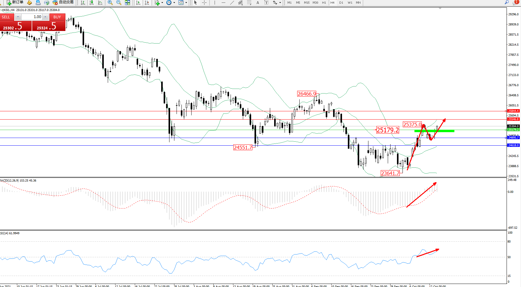 香港恒生指数10月15日(周五)收盘上涨368.37点,涨幅1.48%,报25330.96点;港股三大指数集体收涨,恒生科技指数涨1.92%报6318点。大型科技股走强,腾讯、快手涨超2%,美团涨超4%带动恒指涨近100点。地产股、乳业股、濠赌股等板块纷纷走低。今日大市成交额为1704亿港元,南下资金净流入19.7亿港元。港财务汇报局展开以下行动:1)就中国恒大集团(中国恒大)截至2020年12月31日止年度(2020年年度账目),以及截至2021年6月30日的六个月(2021年中期账目)的财务报表展开查讯;2)对罗兵咸永道会计师事务所(罗兵咸永道)就2020年年度账目进行的审计展开调查(2020年年度审计)。