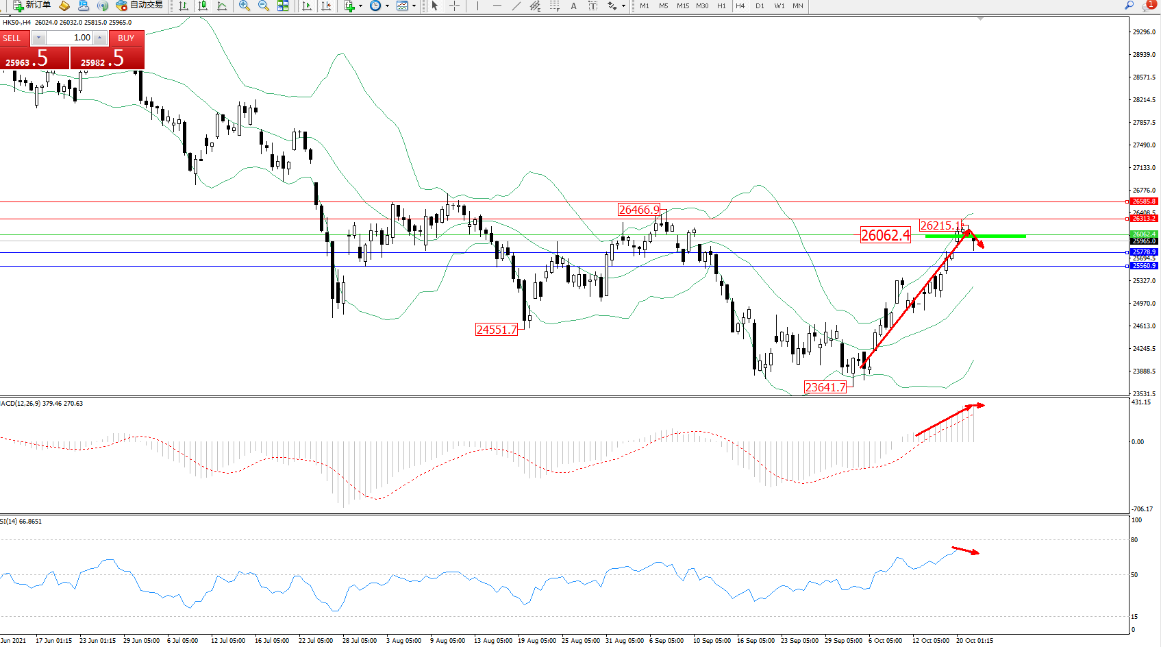 香港恒生指数10月21日(周四)收盘下跌118.49点,跌幅0.45%,报26017.53点;港股今日止步反弹行情,科技股多数回调致大市表现低迷。恒生科技指数跌0.82%报6636点。近日带领大市上涨的权重科技股普跌,京东跌超4%,美团、腾讯、小米、百度皆跌超1%;保险股全线拉升,中国平安大涨超7%,月内反弹达18%,易纲强调恒大风险是个案风险,内房股与物管股携手上扬,在2021金融街论坛分论坛上,香港特别行政区财政司司长陈茂波表示,将提高离岸人民币的流动性,争取完善和扩大各项互联互通安排,为离岸和在岸市场之间的人民币资金提供有效双向的流通管道。陈茂波表示,香港证监会、交易所与香港金融管理局已经成立联合工作小组,推动允许通港股通南向交易的股票以人民币计价,并正尽快把研究成果制定详细的建议措施。
