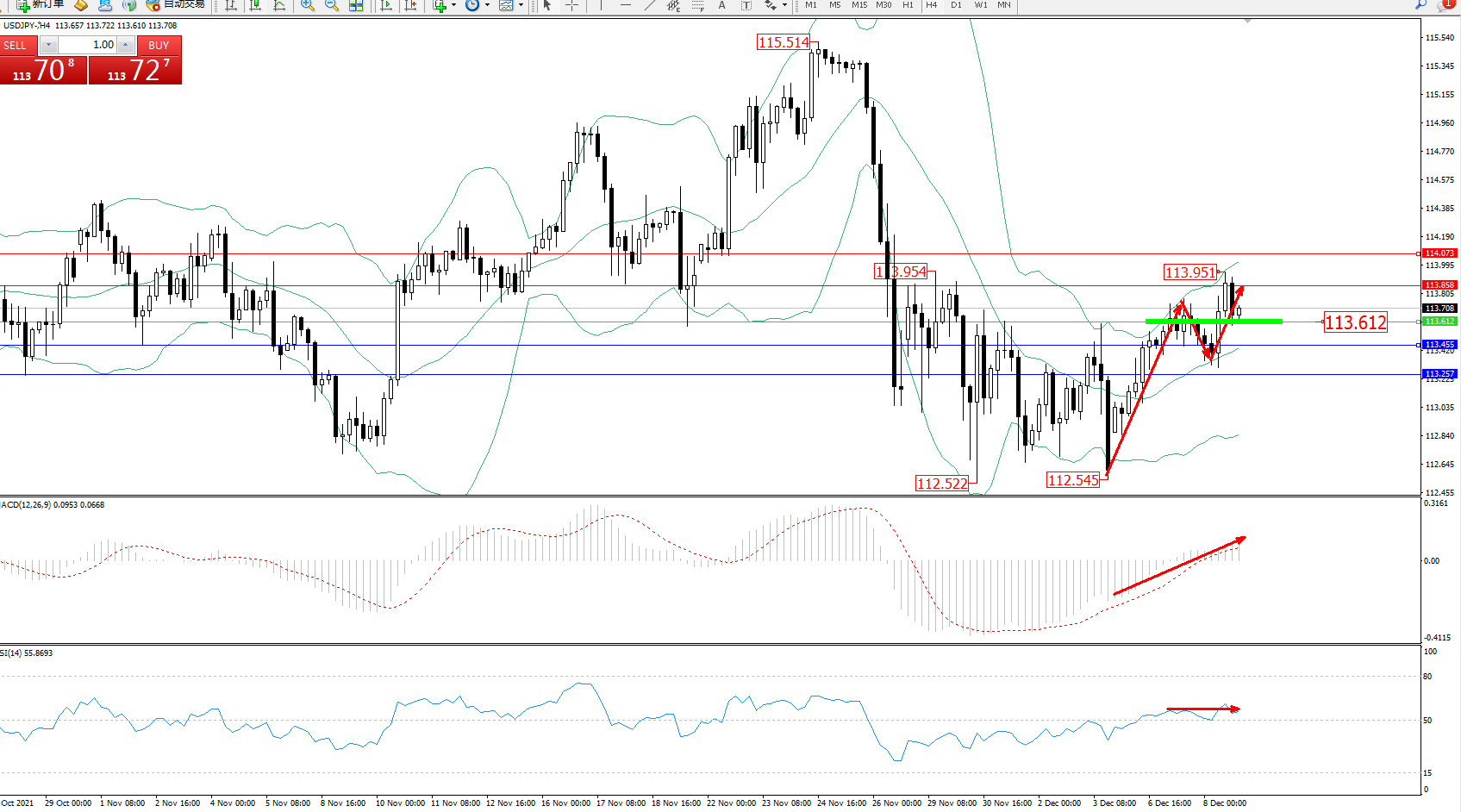 技术点评:低位多头动力延续布林带指标通道中上轨区间持续震荡上扬,高位抵达113.951附近节点遇阻整理,短期多头动力有继续攀升态势,布林带指标呈缓慢张口走势良好,MACD指标多头动力维持整理上移至50均衡线上方不断弱势徘徊上移,RSI指标处于50均衡线上側持续整理平移;