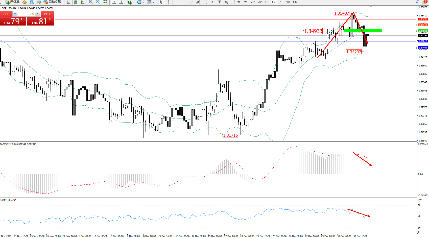 交易策略:1.34933下方看跌,目标1.34612、1.34409