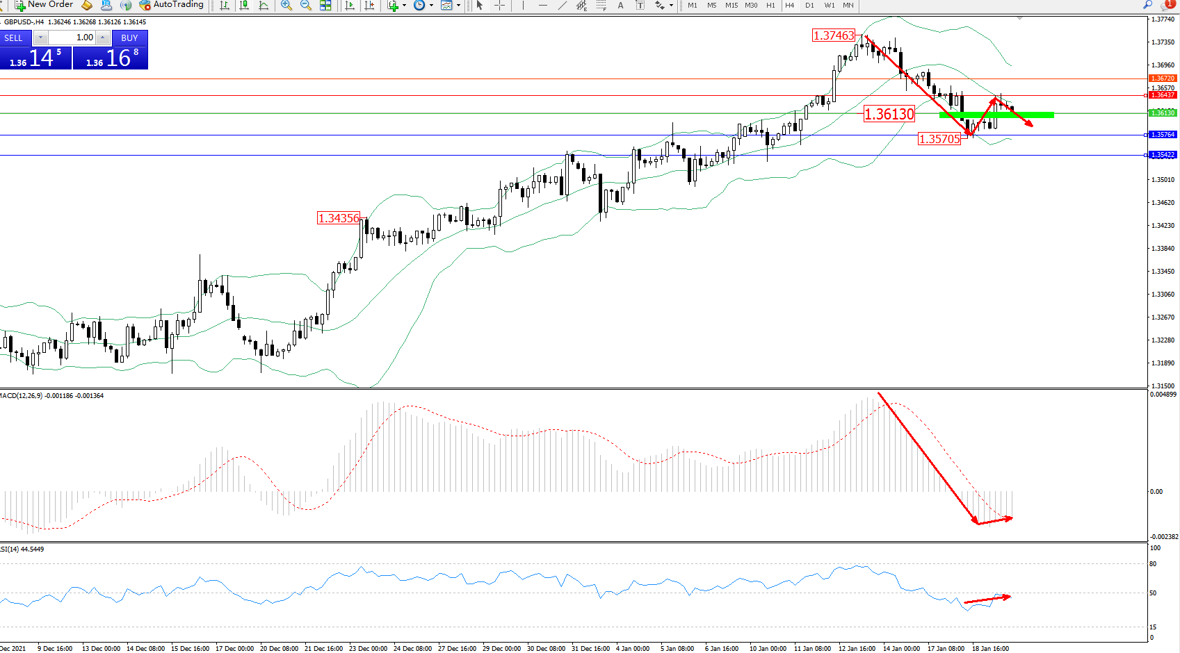 交易策略:1.36130下方看跌,目标1.35764、1.35422