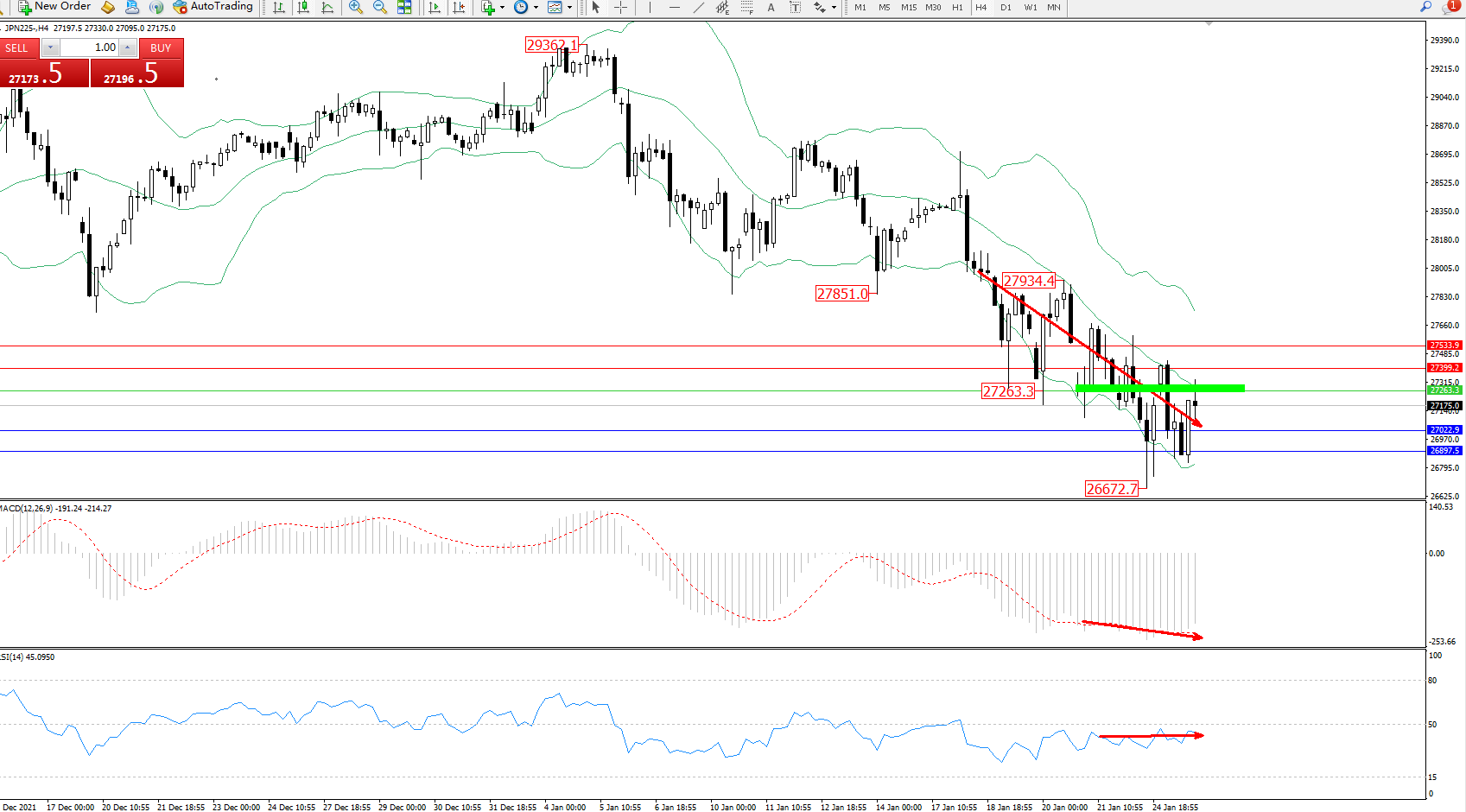 日经225指数1月25日(周二)收盘下跌467.37点,跌幅1.69%,报27121.00点。日本近期的通胀主要由全球大宗商品价格而非日元疲软推动。日本通胀率离达到2%还很遥远。日本央行必须继续宽松政策,因为2%的通胀率仍然遥不可及。与过去不同,日本的通胀前景不仅存在下行风险,也存在上行风险。