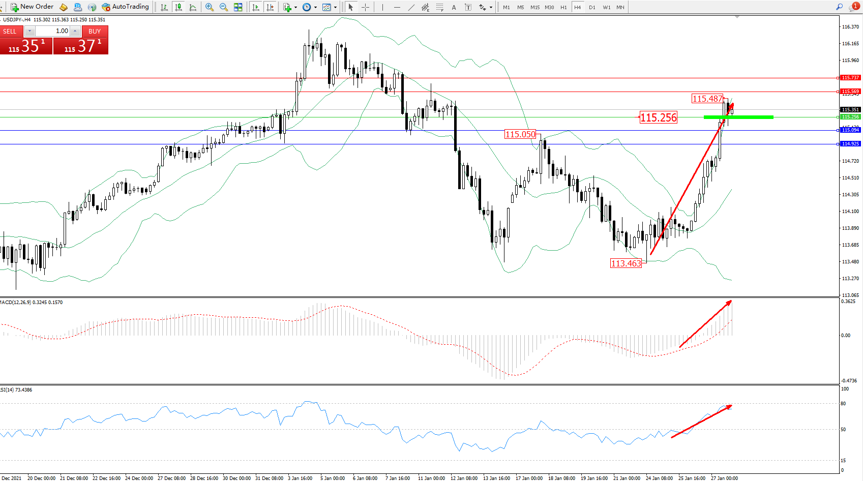 美元兑日圆维持115.351附近震荡,美元攀升至2022年新高,因美联储主席鲍威尔暗示将从3月开始加息周期。美元指数DXY现涨0.14%,延续了鲍威尔讲话推动的0.5%涨幅,大宗商品货币领跌;美元兑日圆避险情绪再度笼罩。