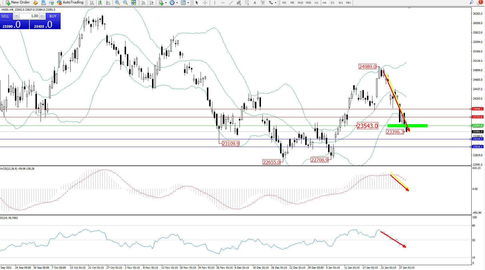 中国 香港交易所 除夕夜,北向交易关闭;当天只进行早盘交易,12:00-12:10之间随机收市。香港恒生指数1月28日(周五)收盘下跌256.92点,跌幅1.08%,报23550.08点;港股牛年最后一交易日再度走低,恒生科技指数跌1.71%。大型科技股多数下跌,拖累大市下跌,京东跌3.2%,小米跌1.33%,网易跌1%,腾讯、百度皆有跌幅,阿里巴巴涨1.38%相对表现较好;香港本地零售股普跌,莎莎国际跌超5%,暂录4连跌创约一年来新低,利福国际和周大福跌约3%。昨日香港新增164例确诊,为爆发新冠肺炎两年以来单日新高,其中仍有超过30例确诊病例源头未找到。香港特区卫生防护中心称,社区内至少有几十条隐形传播链。香港特区行政长官林郑月娥透露,已向广东省政府请求支援以提升香港本地的检测能力。
