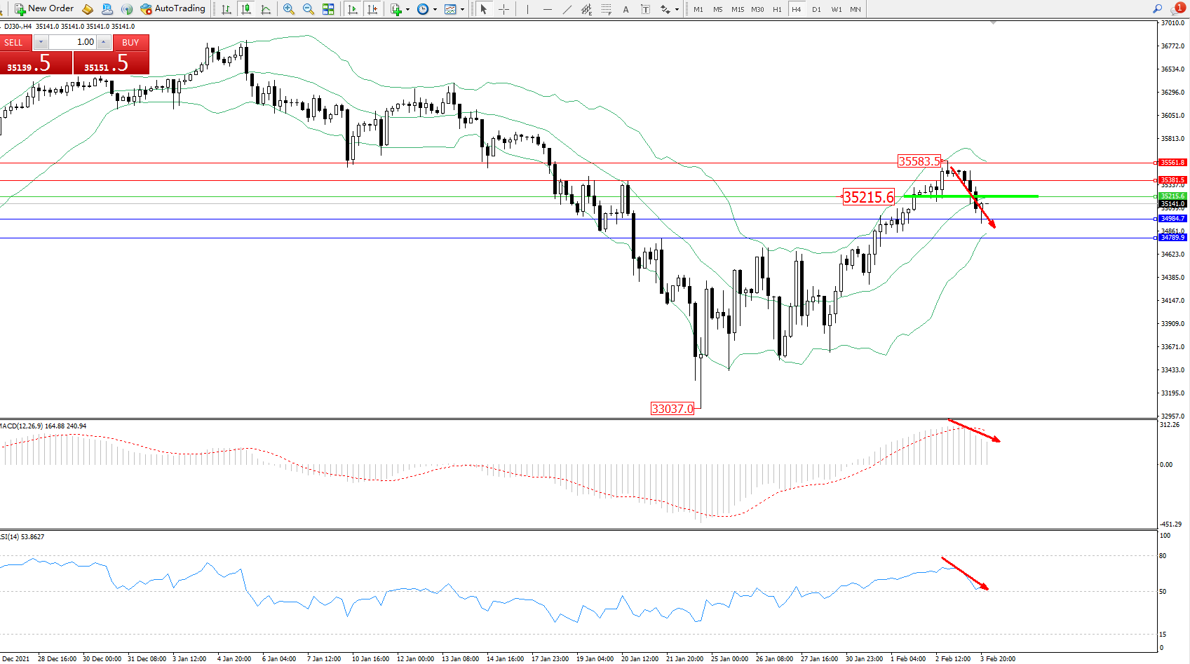 道琼斯指数2月3日(周四)收盘下跌518.99点,跌幅1.46%,报35110.34点;美股收盘,三大股指齐重挫,道指初步骤跌。美国1月份服务业增长回落至近一年来最低水平。与此同时,在非农就业报告将于周五发布之际,数据显示美国上周首次申请失业救济人数下降超过预期,降至23.8万人,市场关注今日非农报告。过去一两天出现的空头回补操作已经结束,市场现在关注的是美联储更大力度收紧政策的风险,市场价格体现了加息50个基点。