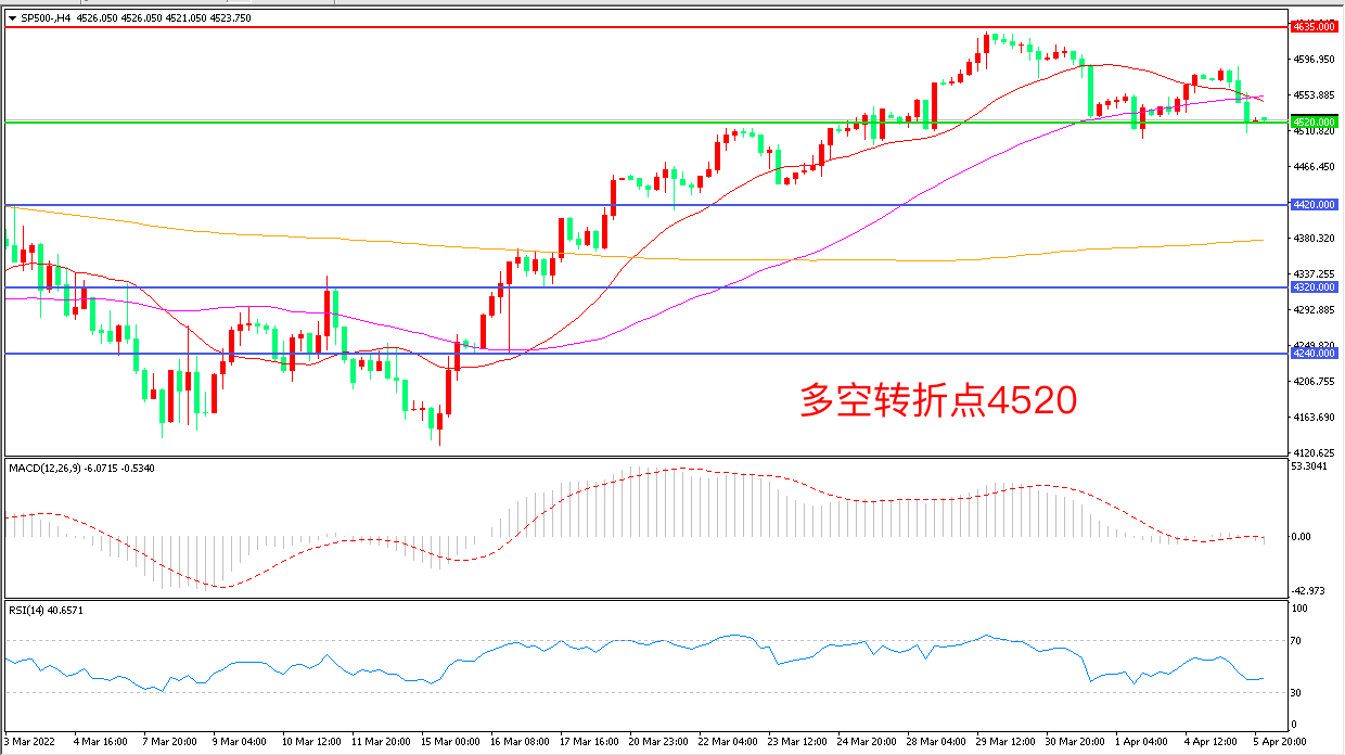 周二(4月5日),被拜登提名为美联储副主席的美联储理事布雷纳德称美联储最快可能5月快速缩表,美国国债收益率集体大幅回升,标普500承压下行,收报4522.75点。目前流动性缩减的市场预期对蓝筹科技股形成巨大杀伤,如果美联储会议纪要延续鹰派表现,可能会对市场情绪再度形成打压,美股将在近期迎来关键考验。