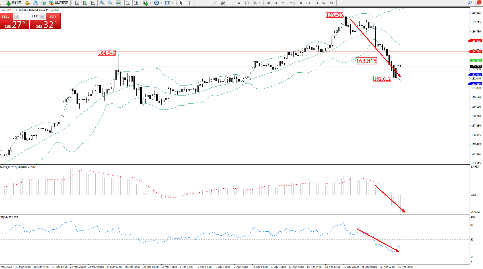 技术点评:空头动力延续布林带指标下轨附近持续震荡下挫,低位抵达162.012附近接受开始整理,短期处于低位弱势震荡中,布林带指标呈张口走势持续,市场空头情绪笼罩,MACD指标处于0轴线下方空头区域持续震荡下行,RSI指标处于空头区域维持震荡下挫后震荡;