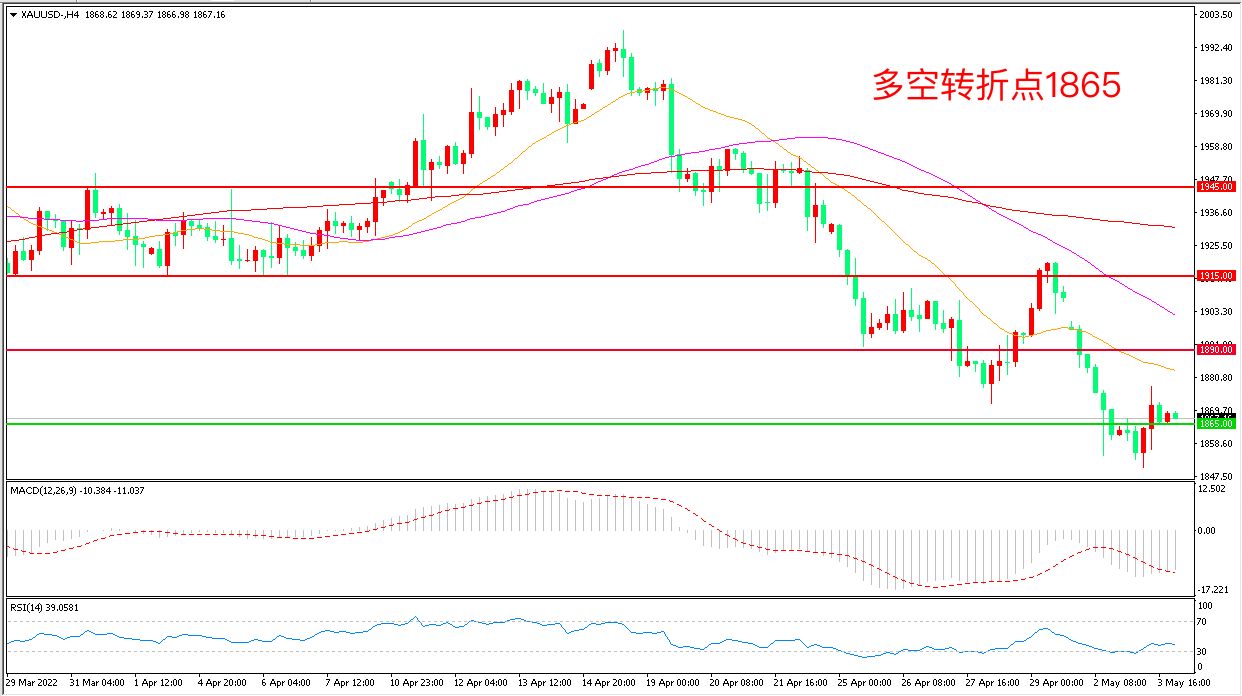 周二(5月3日),美联储议息会议即将召开,投资者预期将加息50个基点,现货黄金延续低位震荡,收报1868.45美元/盎司。事实上通过近期美联储多位官员的密集“放鹰”,本次会议上的政策基调已经基本明朗,关键是鲍威尔在新闻发布会上的表态,是否会暗示美联储在6月之后继续以50个基点为增量的加息,务必重点关注。