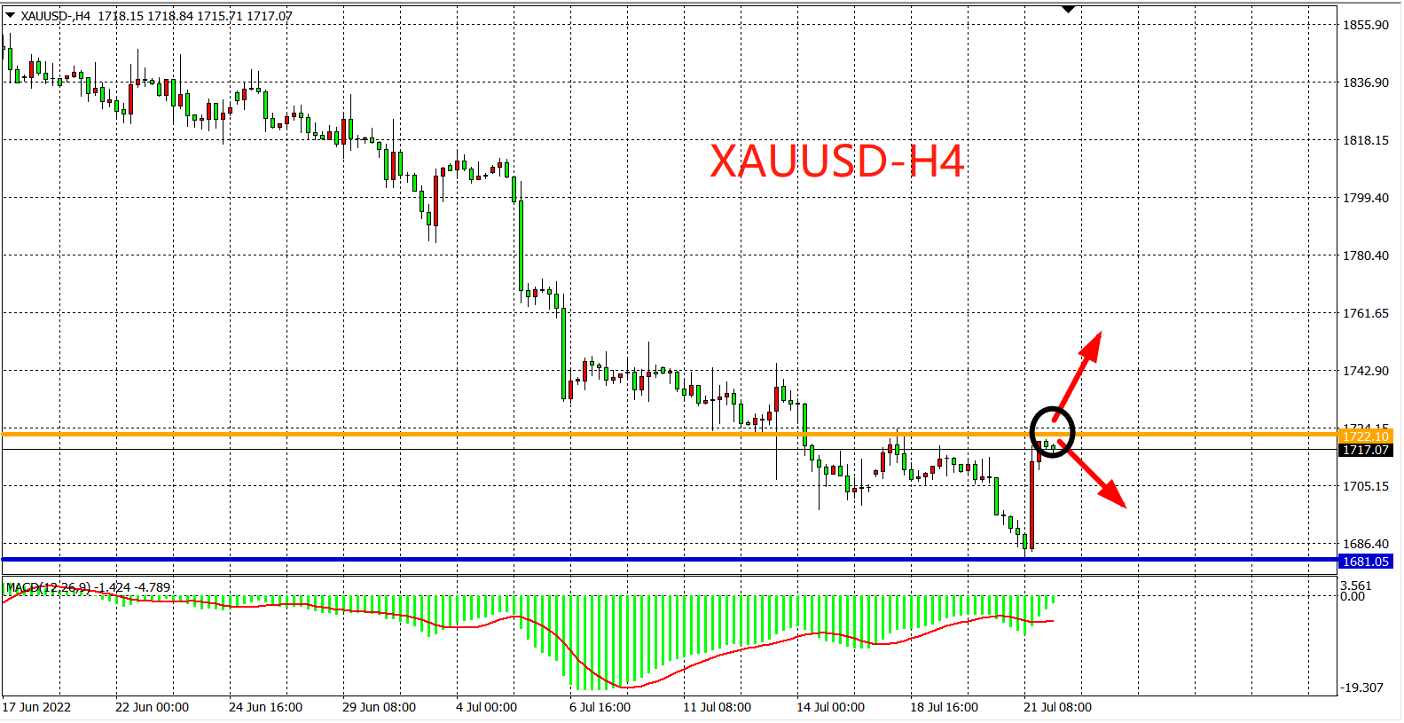 交易策略:在1722.00之下看跌,目标1700.00          1680.00
