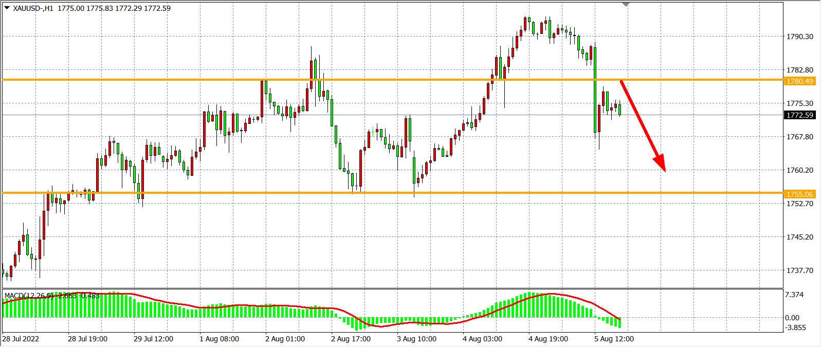 1小时图看,金价高位回落再度跌破1780,目前支撑1780再度转化为阻力,MACD于零轴之下开始放量,预示行情或有进一步走低的动能,日内在1780之下看回调为主,下方目标1755-1740