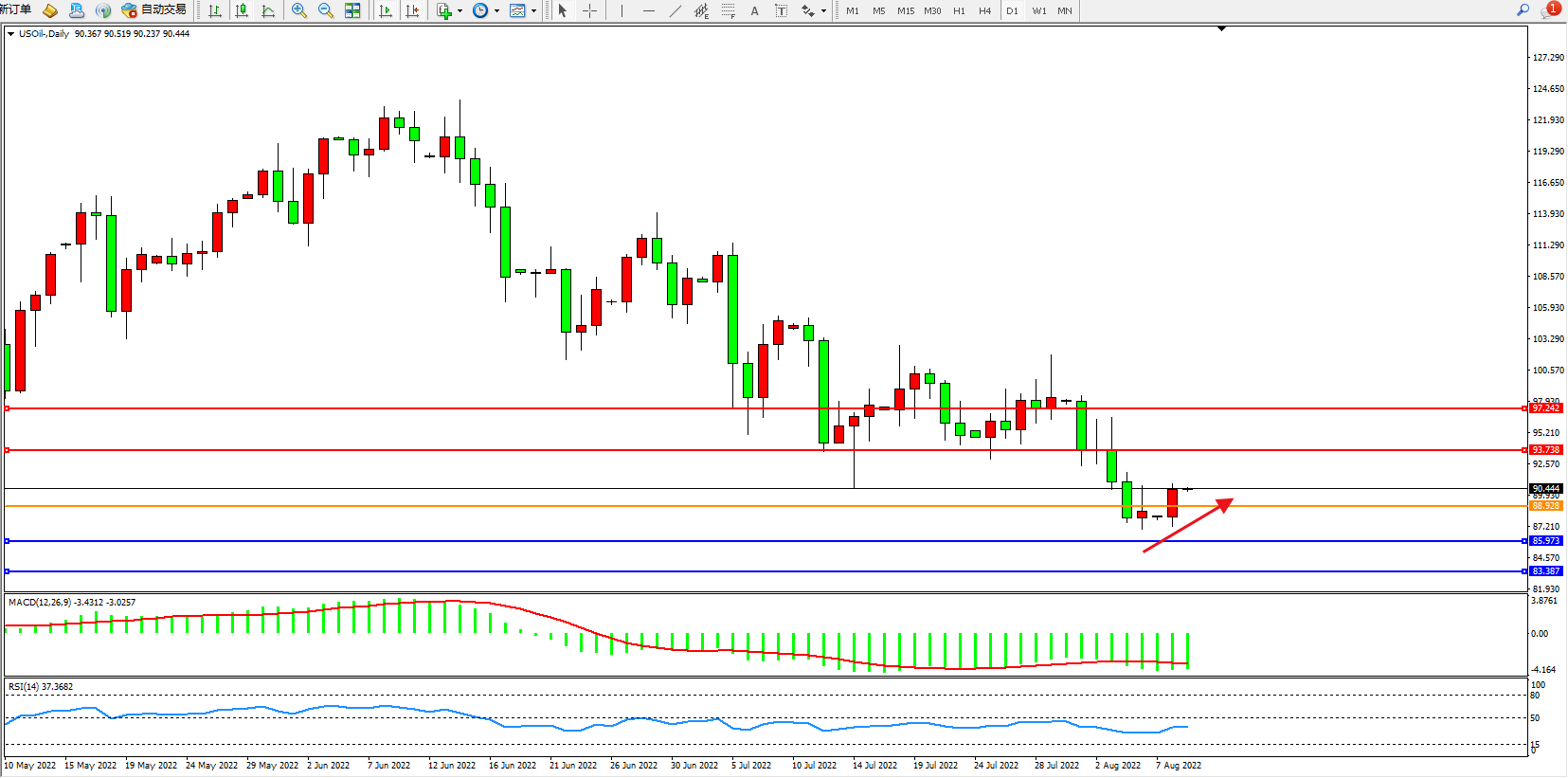 原油USOil——4小时K线图显示: