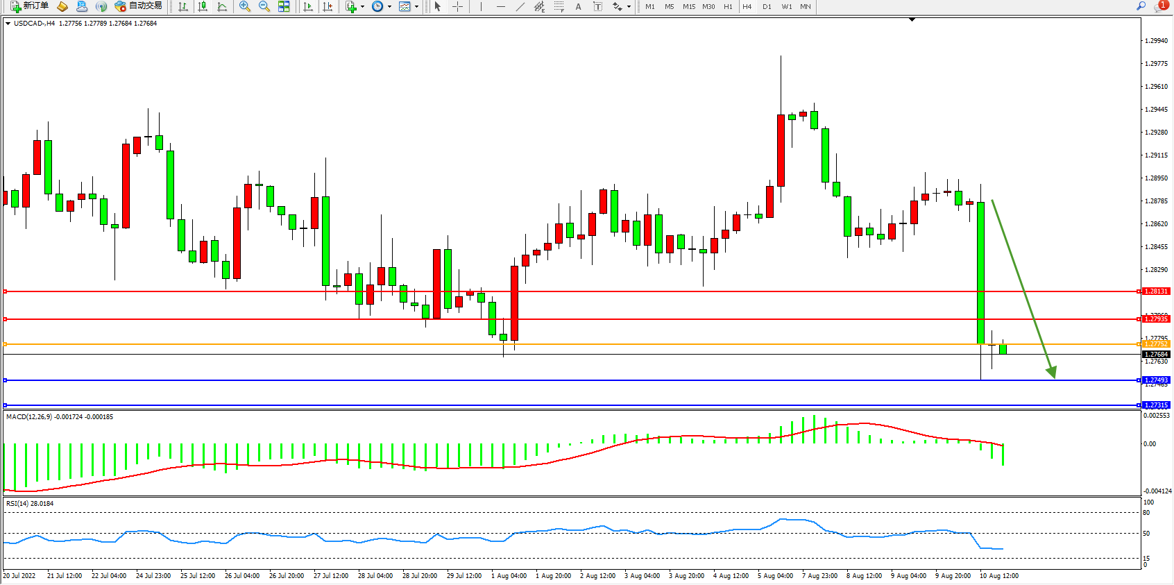 美元加元USDCAD——4小时K线图显示: