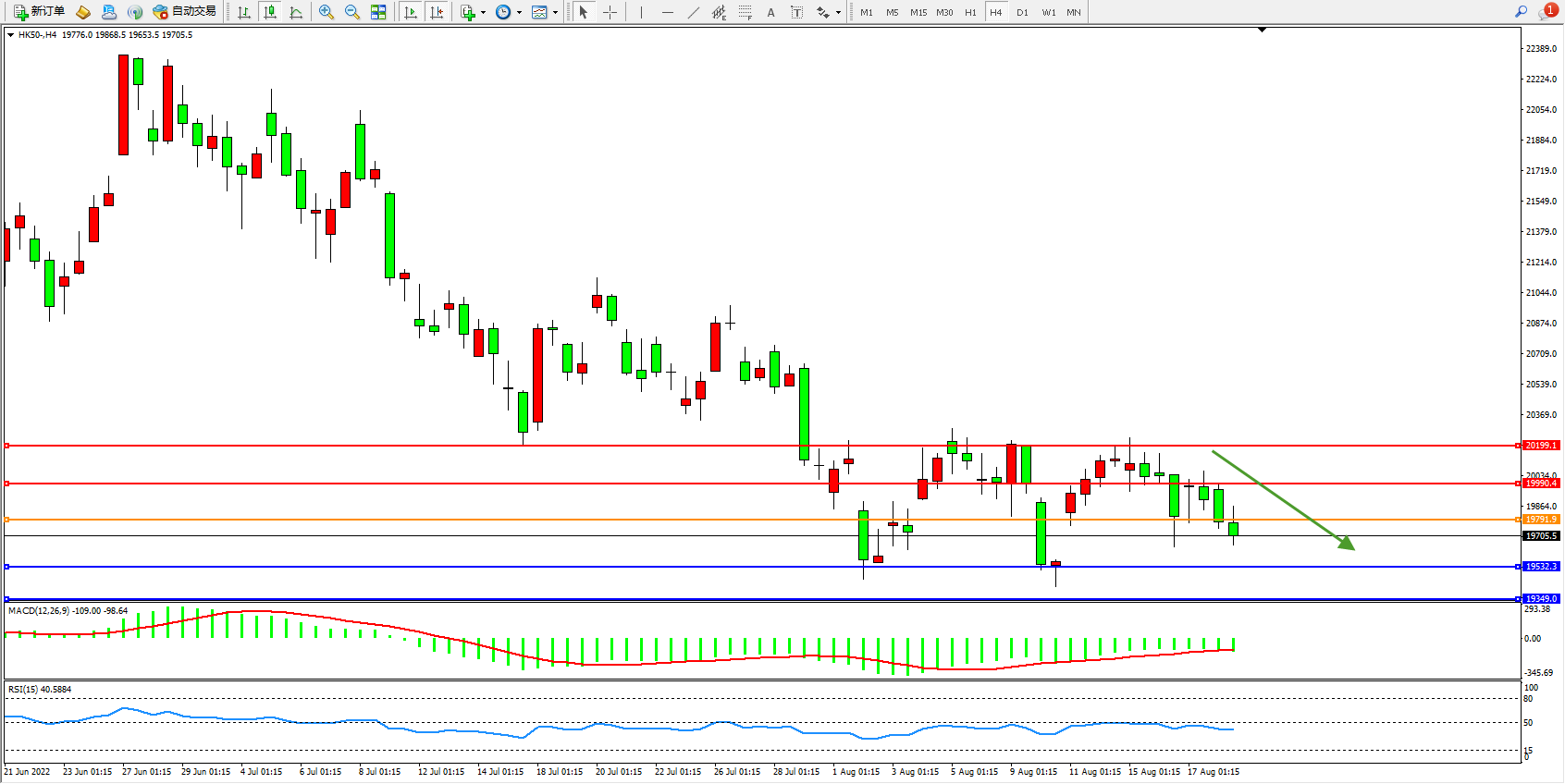 香港恒生指数8月18日(周四)收盘下跌158.54点,跌幅0.8%,报19763.91点;港股全天走弱,恒生科技指数午后一度跌近2%,尾盘回升收跌1.09%,大型科技股普遍下跌,百度跌超3%,阿里巴巴、京东跌超2%,快手、网易跌超1%,腾讯业绩超预期逆势上涨超3%。今日南下资金净流入17.17亿港元,大市成交额为893亿港元。加息受回股香港银行股普跌,香港渣打银行宣布调整新造按揭贷款息率,封顶息率由最优惠利率-2.75%上调至-2.5%。