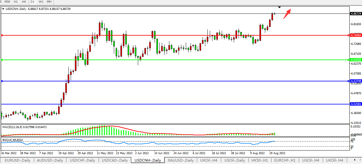 日线图看:短期汇价继续小幅拉升,MACD运行于0轴上且量能0轴上开始放量,RSI整理上行,预计短期汇价大概率将在回测整理后进一步上行。
